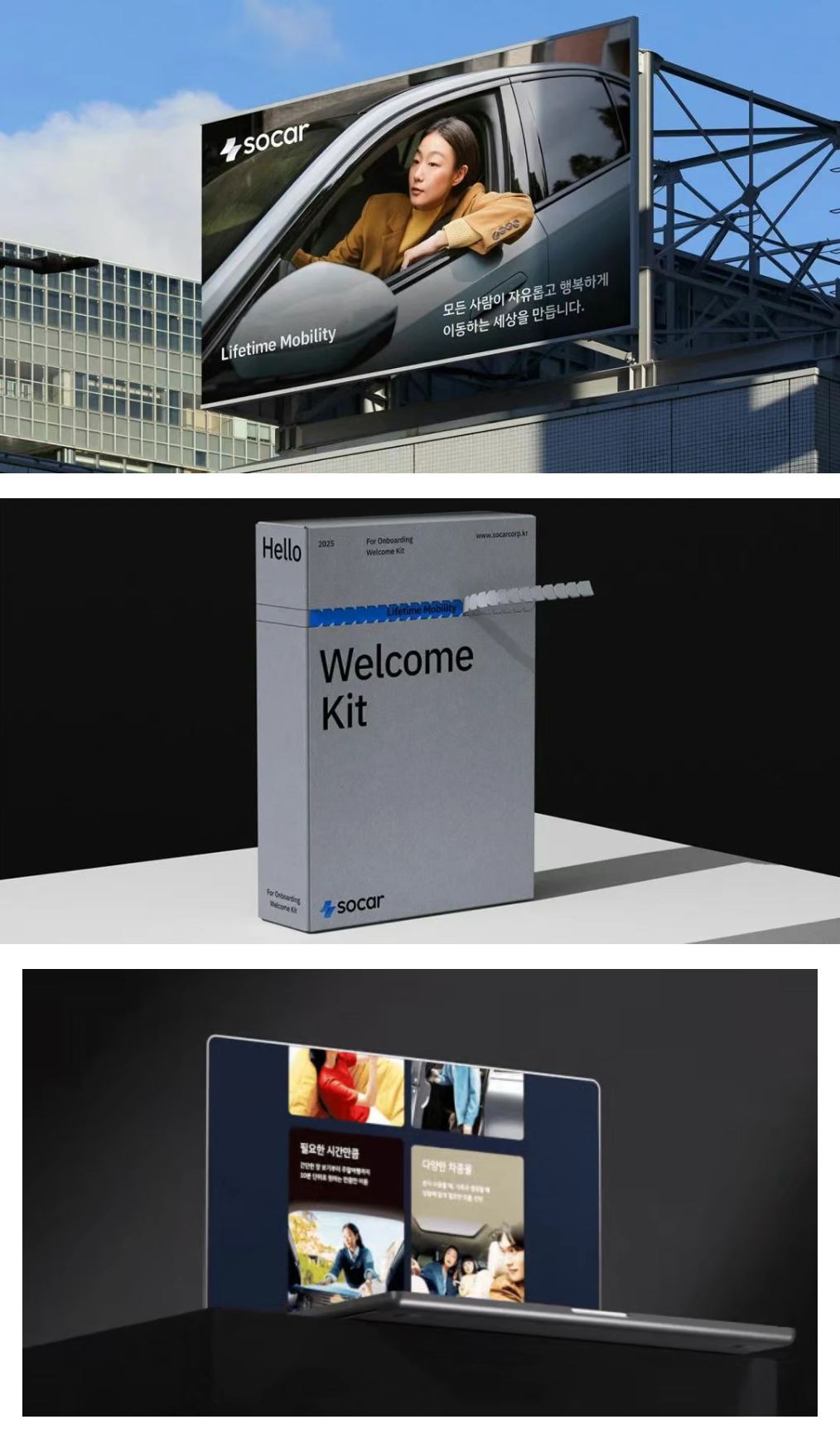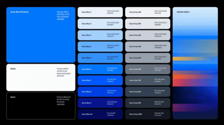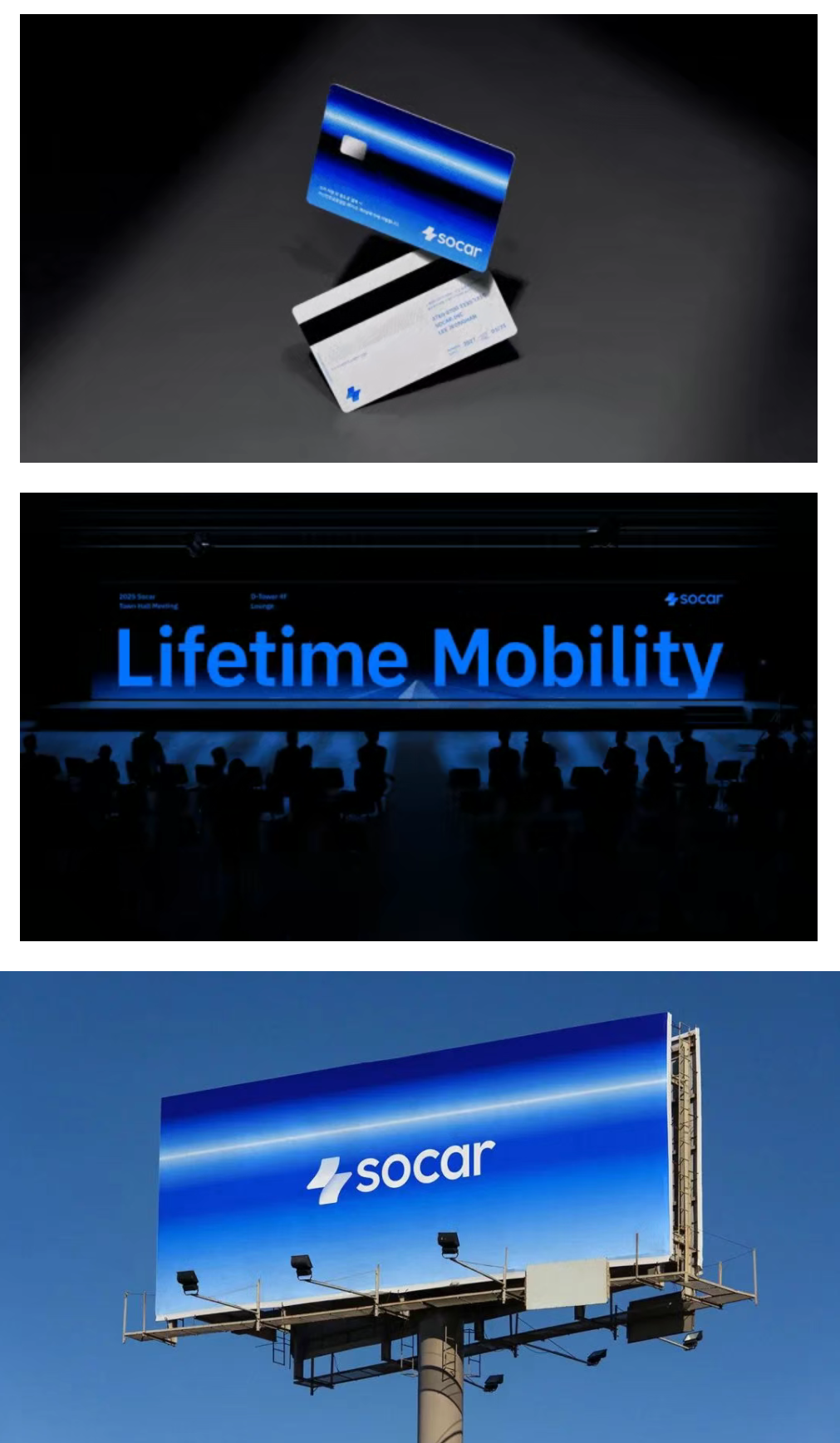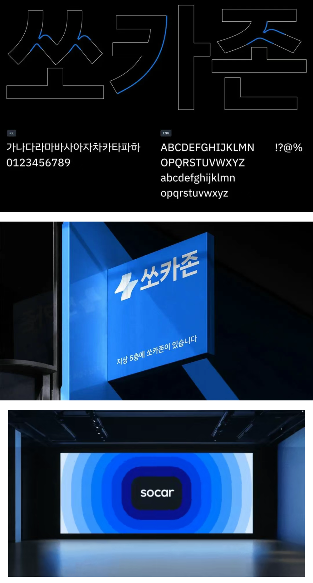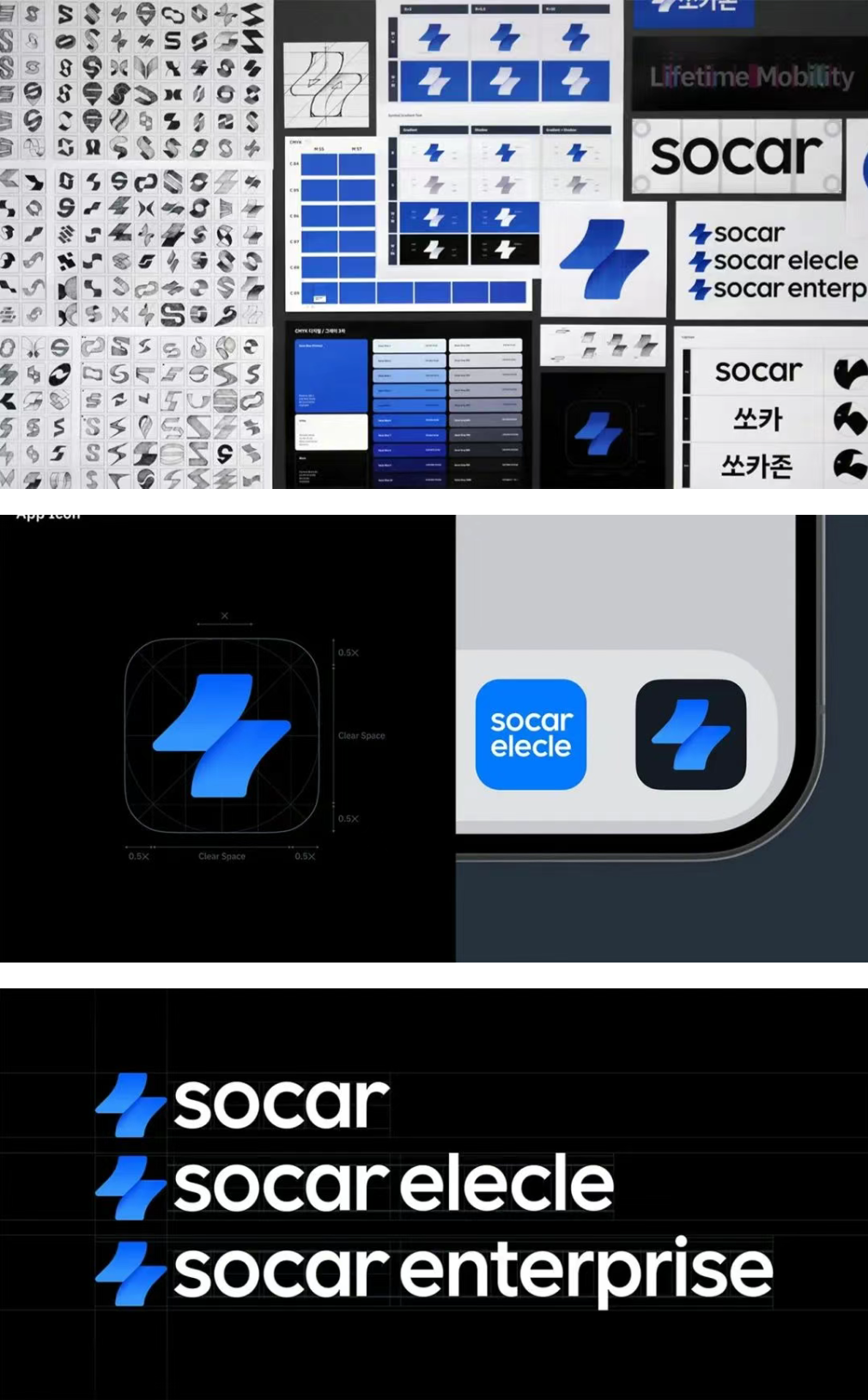 此外,新标志的文字部分也从现有的大写字母改为小写字母组合,以强调其柔和、现代的视觉形象。品牌核心色「Socar Blue」调整亮度和对比度,提升易读性。同时,蓝色系也进行了扩展,确保在各种设备环境和背景下都能保持稳定的可视性。