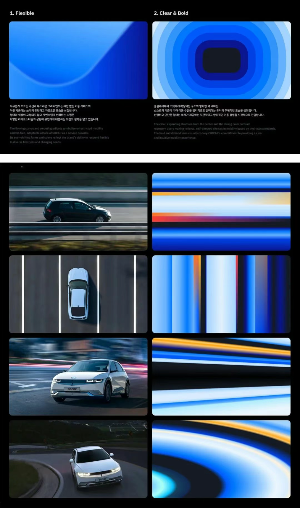 SOCAR全新的品牌设计设计语言围绕「灵活」、「清晰」和「扩展」三个关键词展开,自由流动的曲线和渐变象征着运动的自由,从中心向外扩展的强劲形状代表着主观的运动选择,而受残像启发的各种线性构图则象征着通过 SOCAR 实现运动的连续性和扩展性。这些图形既可以扩展为动态图形,也可以扩展为静态图像。