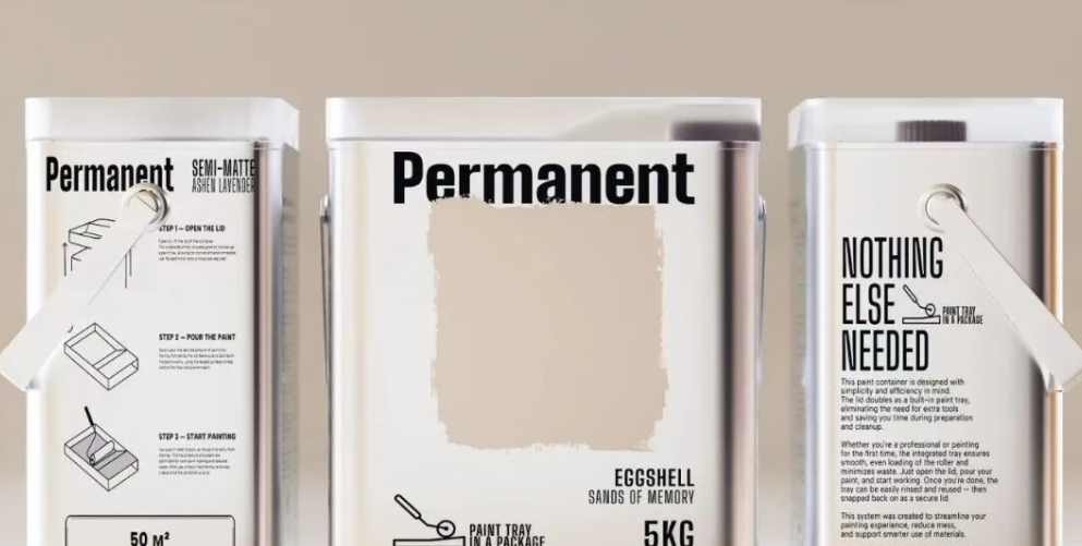 其包装设计的关键创新在于将容器盖子直接设计为内置的油漆托盘,让包装突破 “仅用于存储” 的传统功能,变身实用工具 —— 使用时无需额外准备托盘等器具,打开盖子、倒出漆料即可开始涂绘,准备工作仅需几秒,大幅简化流程;