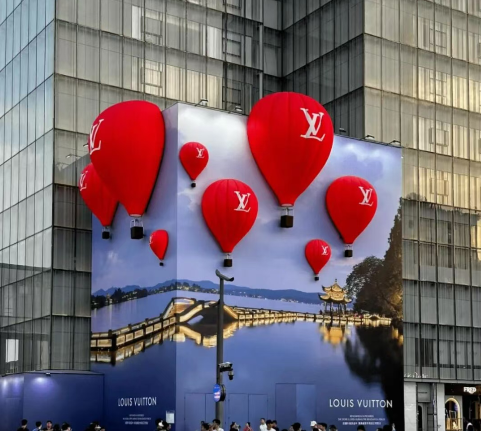 就像前面提到的LV 杭州门店,这家门店几步之外就是杭州西湖,直取旖旎的西湖实景风光印在围挡,品牌很好地将自己与城市地标景观融为一体,不仅拉近了与当地用户的沟通距离,还为游客提供了地标指南,加上抢眼的红色热气球,LV 所蕴含的品牌旅游文化得到了生动诠释。
