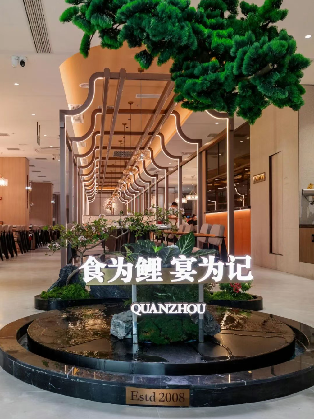 局部采用大理石纹理呼应泉州老厝的石板路意象,辅以灯笼式吊灯与镂空花窗,延续闽南文化空间中的“留白美学”。
