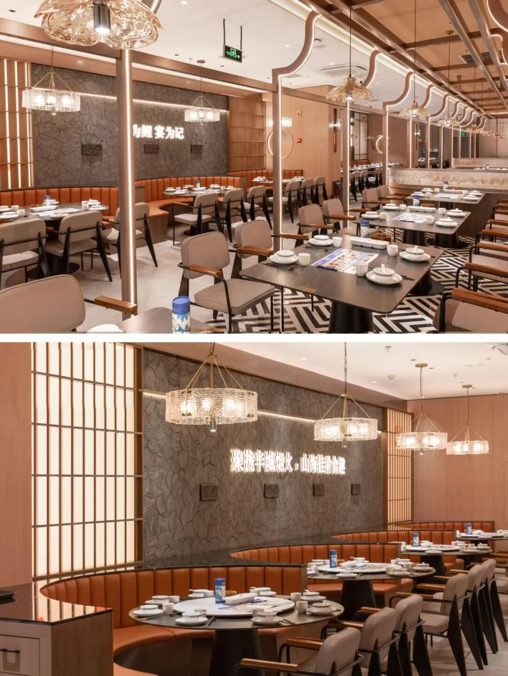 在空间打造上,食为记更强调“宴”的仪式感与“食”的情绪联结。整体空间以暖檀木色为基调,融合古铜金属、石材肌理与现代灯光语汇,营造出温润含蓄的东方雅致气氛。