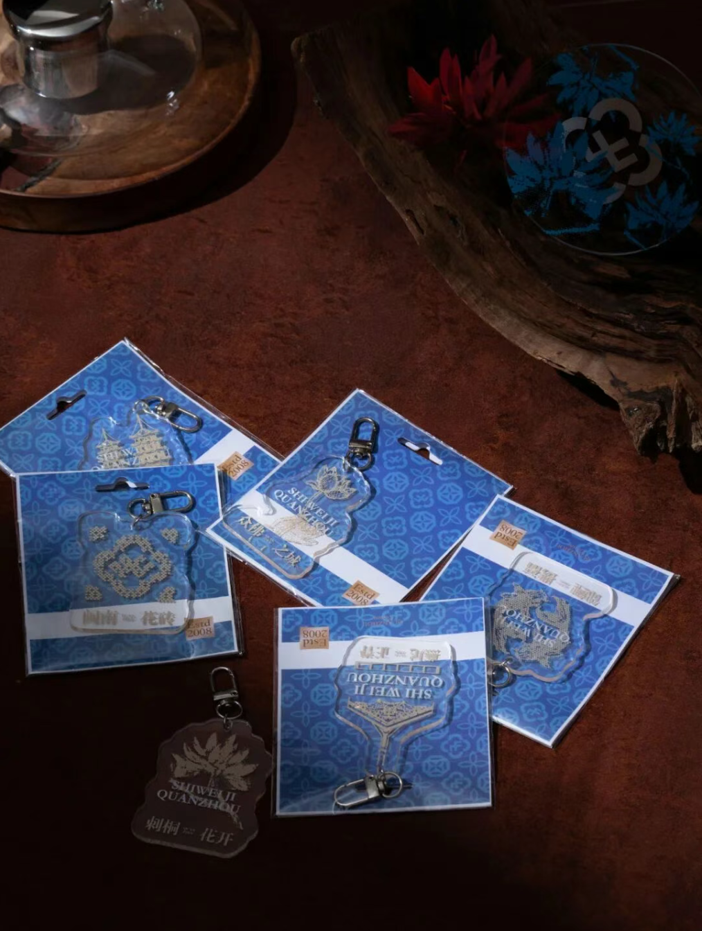 除了花砖纹样系统,辅助图形还进一步拓展至城市文化符号的提炼与图腾化表达。泉州作为“鲤城”,有着丰富的文化地标——刺桐花、东西双塔、燕尾脊屋顶等。
