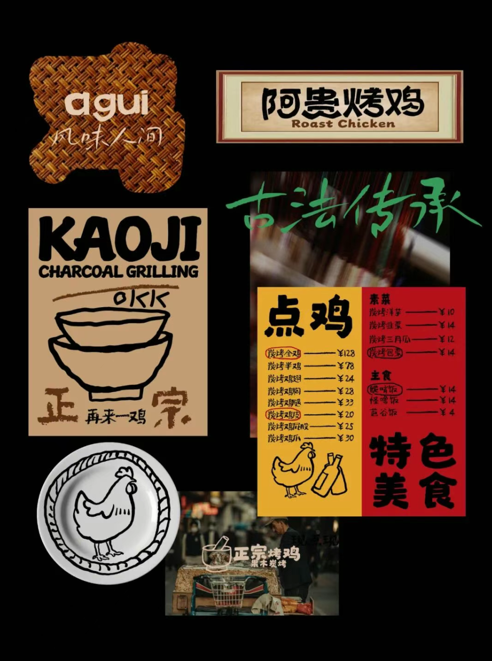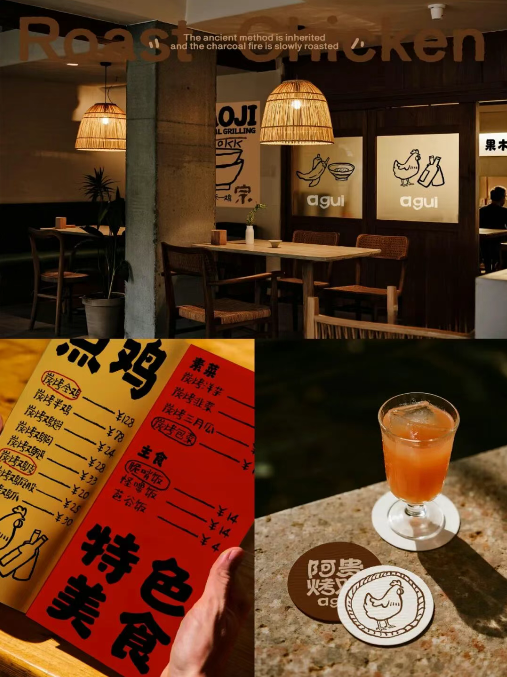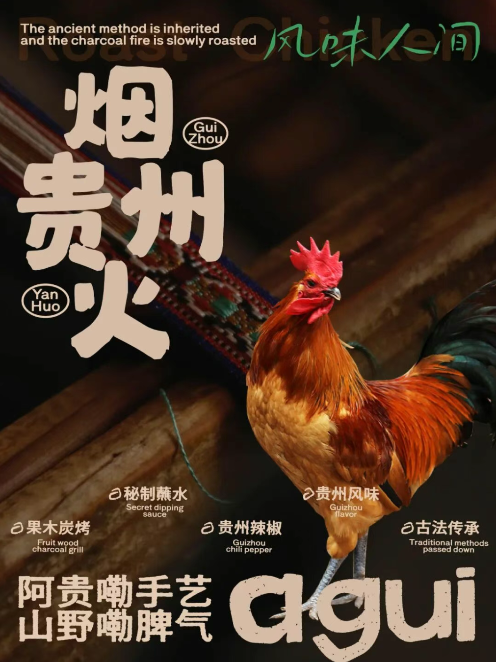 贵州风味美食,烤鸡,展现一个烟火气的餐饮品牌形象,通过视觉设计传递出品牌 “风味人间,果木炭烤” 的理念。