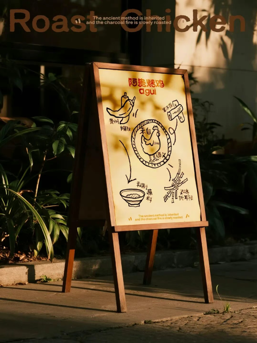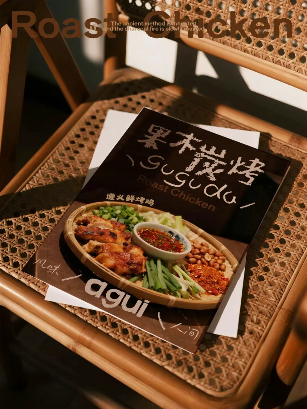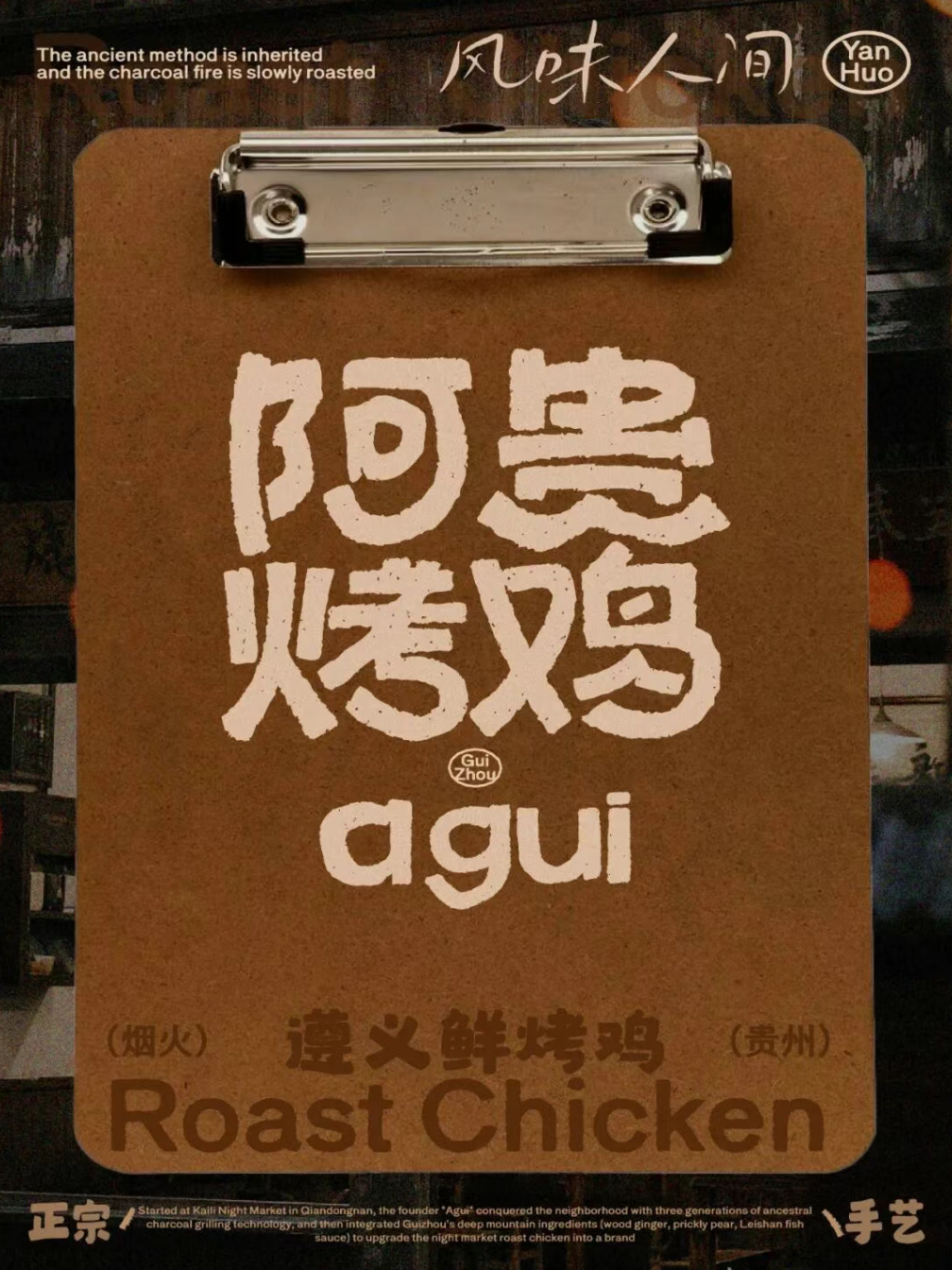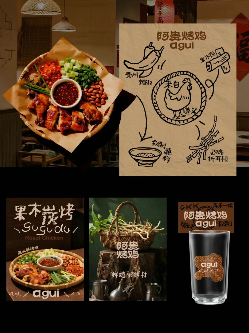 贵州风味美食,烤鸡,展现一个烟火气的餐饮品牌形象,通过视觉设计传递出品牌 “风味人间,果木炭烤” 的理念。