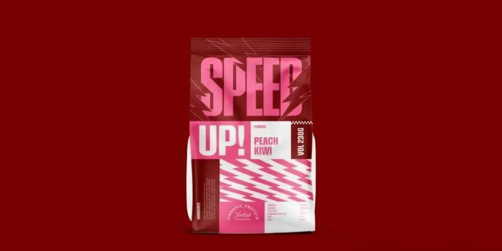 包装中“SPEED/FRESH/POWER” 等文字采用粗体破碎字体,搭配 “UP!” 的醒目排版,强化 了“能量提升” 的视觉冲击力,让包装自带活力气场。再辅以高饱和的色彩,高度适配年轻健身群体高效、活力、个性的需求,使这款蛋白粉的补给属性,成为活力生活的专属符号。