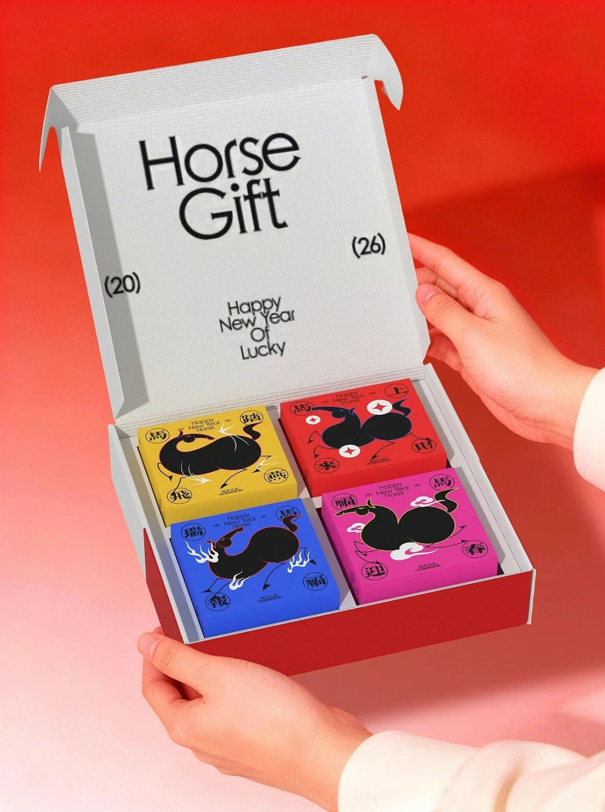 整体设计紧扣 “年轻化、亲和力、东方美学” 三大核心,视觉上既保留了东方文化的底蕴,又用潮流化的表达拉近了与年轻群体的距离。主礼盒采用红白撞色搭配简约线条,卡通小马头像与英文字样的组合弱化了传统年味的厚重感,增添了俏皮的亲和力;内部分装的四色小礼盒堪称点睛之笔,明黄、正红、宝蓝、玫粉的高饱和度色彩碰撞极具视觉冲击力,打破了春节礼盒单一的红色系审美。
