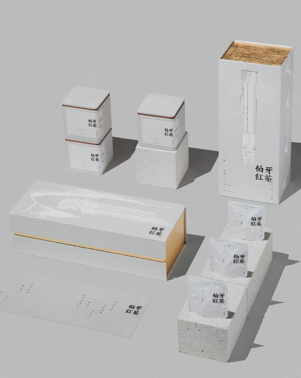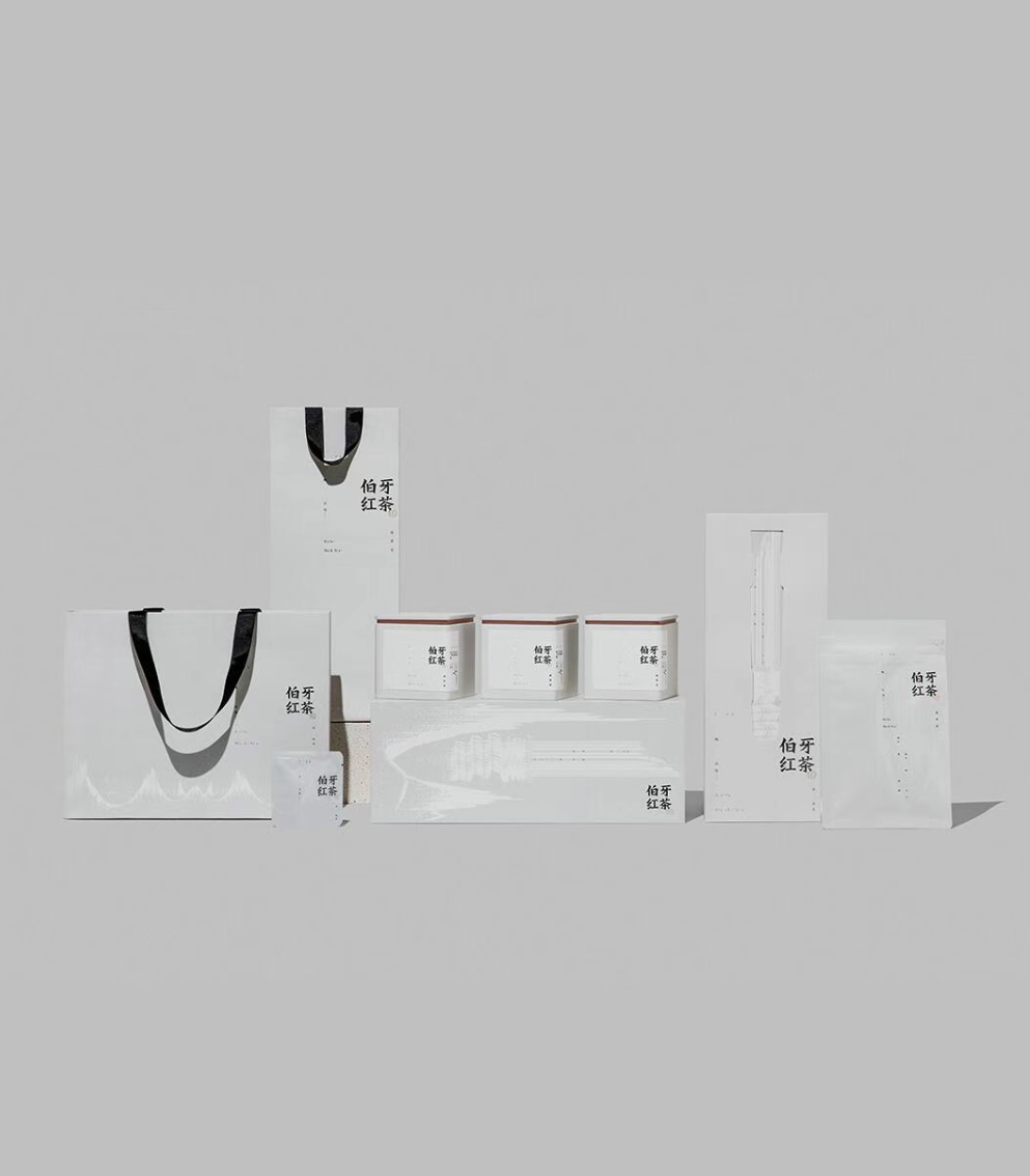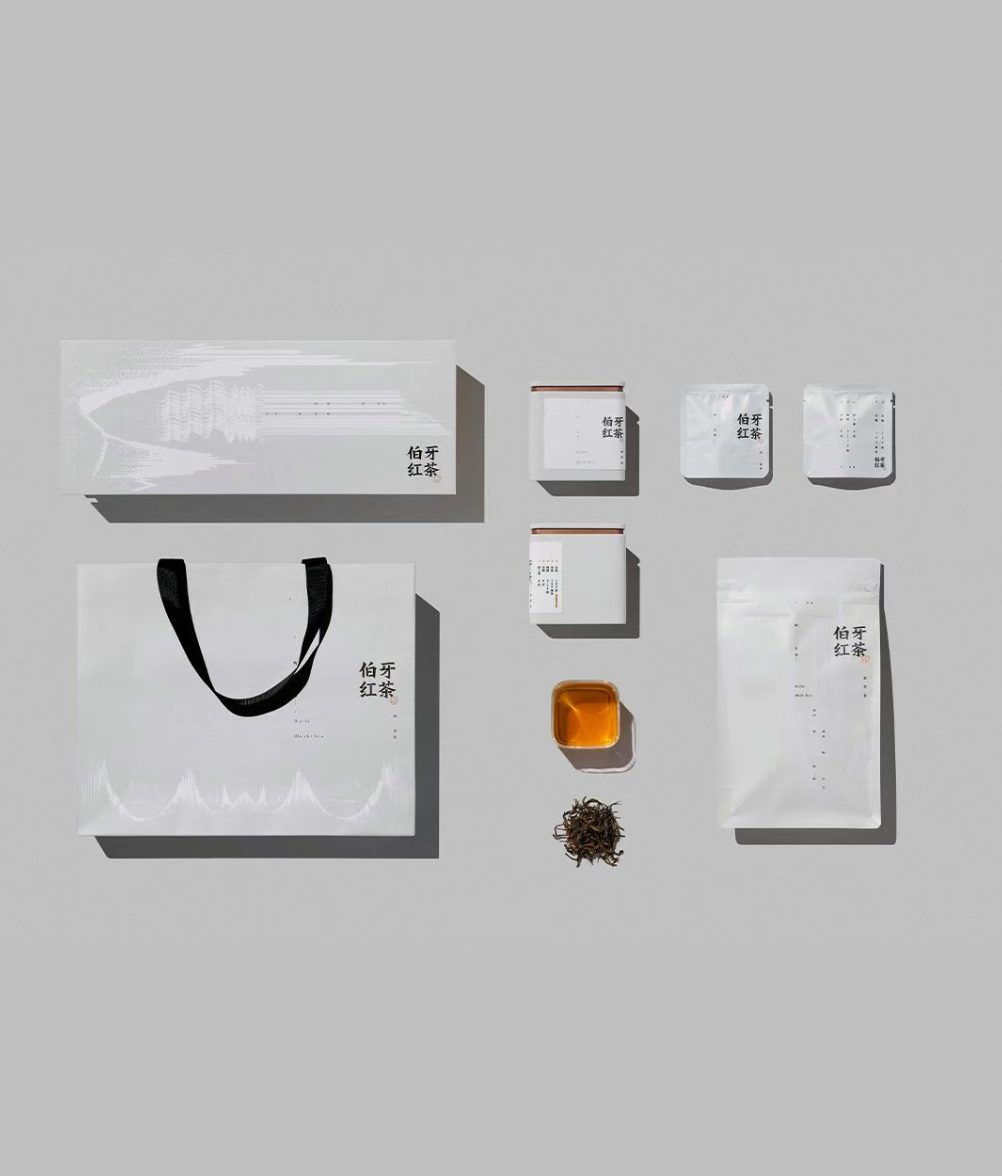 整体的包装设计是传统知音文化与现代极简美学的高阶融合:黑白灰的低饱和主调裹着细腻肌理,浅棕烫金点缀出轻奢质感,既契合红茶的雅致属性,又适配当代高端审美。古琴线条的暗纹藏于包装细节,呼应 “伯牙” 的文化内核,让 “知音茶韵” 不流于表面;泡茶参数的清晰排版、小罐与礼盒的层级设计,既保留了茶礼的实用属性,又以极简版式消解传统茶包装的繁复。把高山流水视觉化呈现以音律的方式表达。将古琴外形镂空成封套,取出礼盒好像谱写一首高山流水。让人在品茶前,便能感受到那份穿越时空的自然韵律。