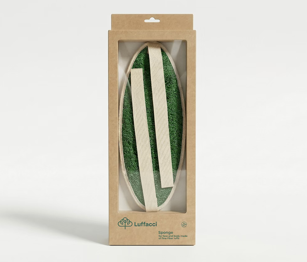 包装采用透明开窗设计,完整露出丝瓜络清洁巾的天然纤维肌理与色彩,让消费者直观感受到细纤维丝瓜络的原生质感,传递天然未经加工的产品特质。 清洁巾本身被设计成叶片 / 果实形态(如柠檬形、苹果形),既呼应丝瓜络的植物本源,又让产品在开窗中呈现出自然美感,强化植物护肤的品牌认知。