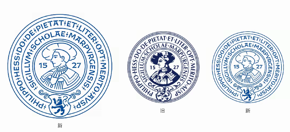 全新的设并非完全摒弃传统印章,而是在保留印章元素的基础上进行简化和现代化重绘。大学官方LOGO中,传统印章中的「腓力头像1」被提取出来变为主视觉图形,与「Universität Marburg」文字并列组成全新标识。