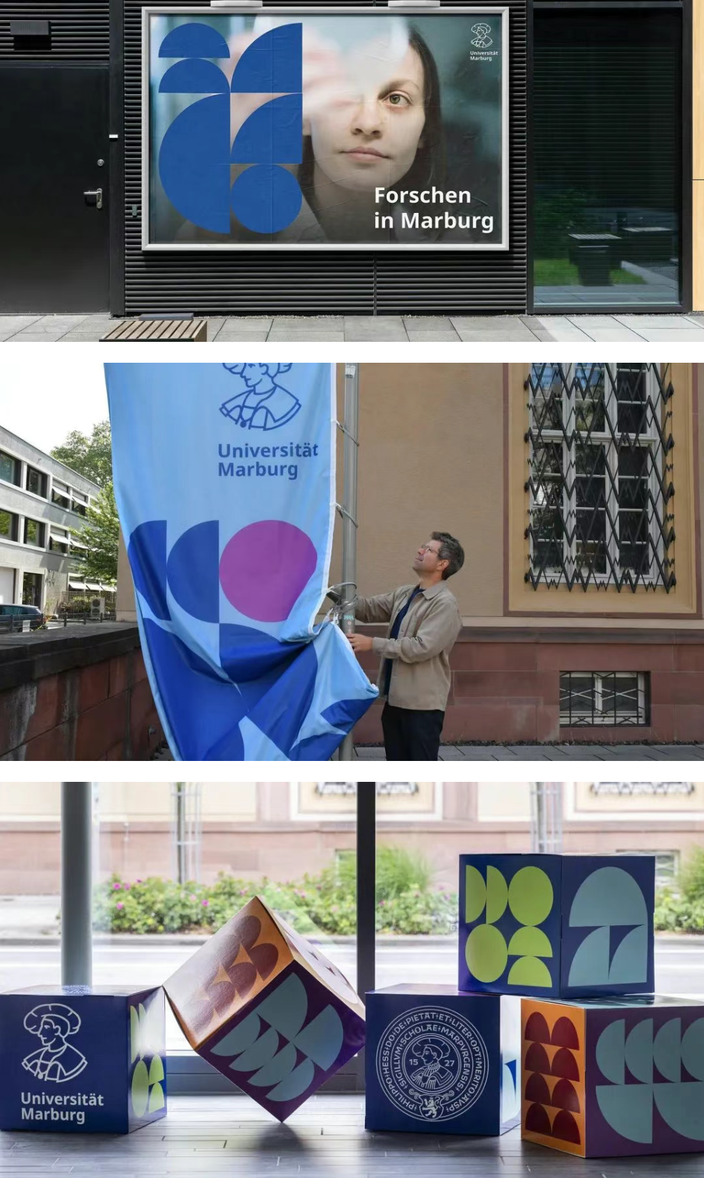 如今不少机构都在追求几何图形构成的极简设计,如四分之一圆、半圆等基础元素。但这类设计风格容易导致“视觉同质化”问题。在马尔堡大学此次采用的设计模式中,圈形几何也成为主要视觉元素,但类似手法已被多个大学或媒体机构使用,品牌识别度可能因此受限。