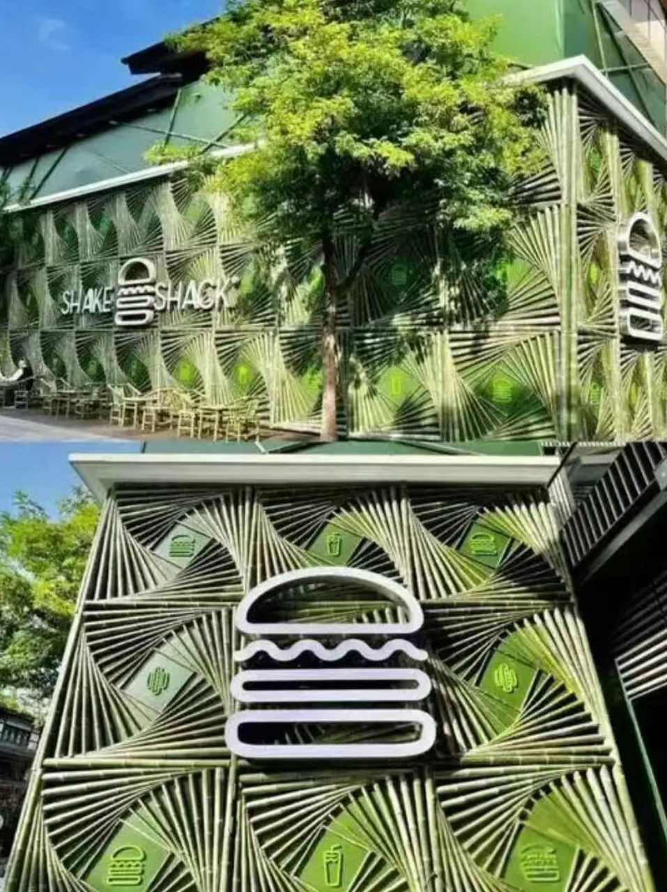 而 SHAKE SHACK 在其它城市的围挡设计,也颇具当地风情。成都门店应用了大熊猫故乡标志性的竹文化,结合成都“非遗”竹编工艺打造了一座两层楼高的“竹堡”,颇具艺术感的同时,也将悠闲自得的城市文化诠释得淋漓尽致;