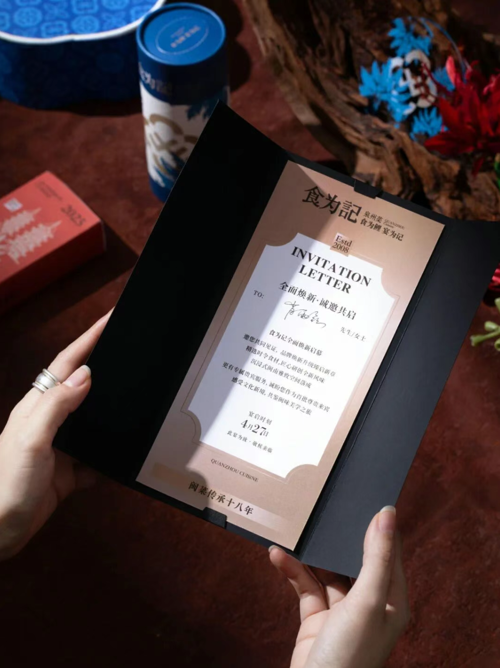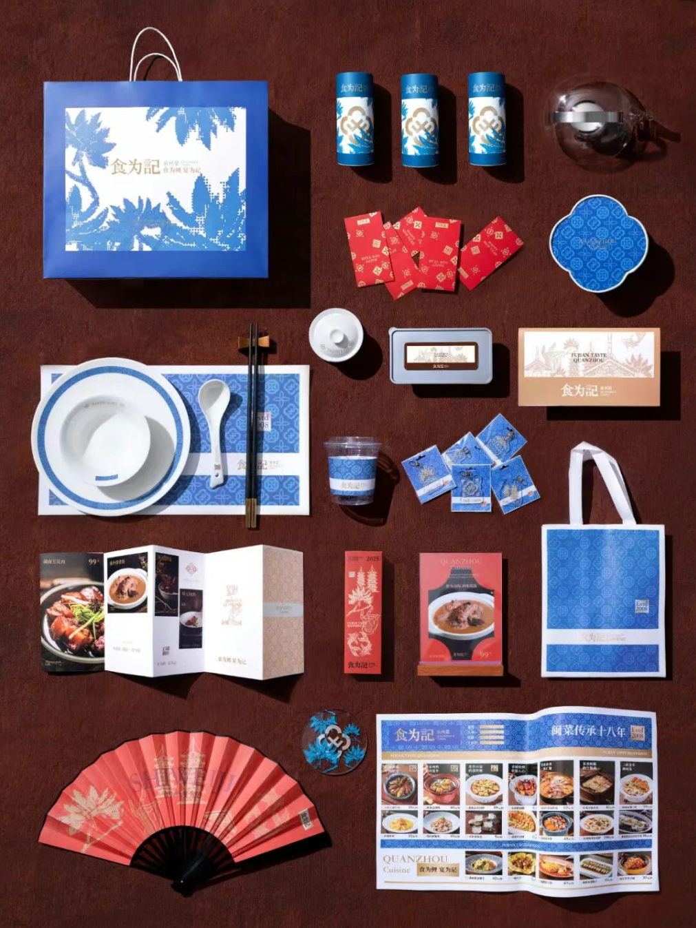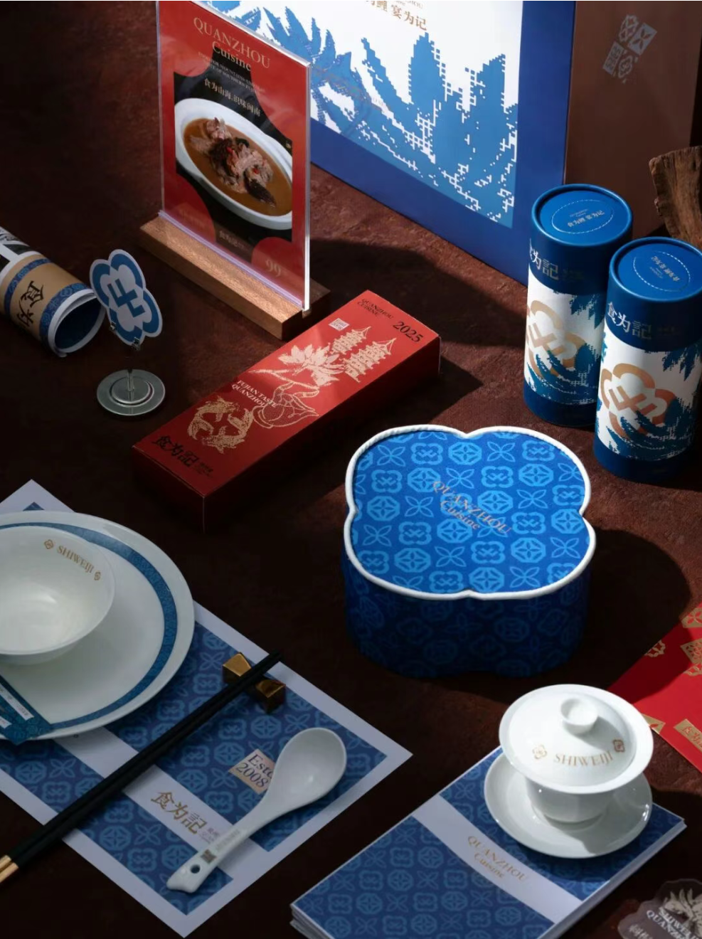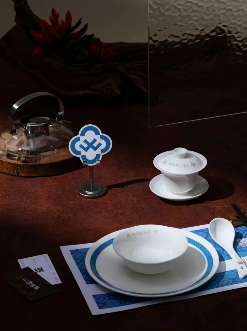 品牌不再只是装饰性的背景元素,而是被赋予“文化印章”的功能:它出现在碗碟边缘、菜单封面、礼盒包装,甚至空间的墙体与地面材质上。