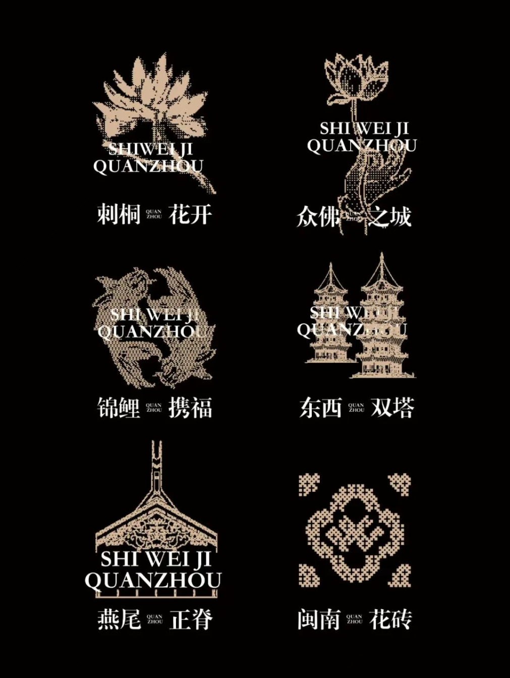 除了花砖纹样系统,辅助图形还进一步拓展至城市文化符号的提炼与图腾化表达。泉州作为“鲤城”,有着丰富的文化地标——刺桐花、东西双塔、燕尾脊屋顶等。