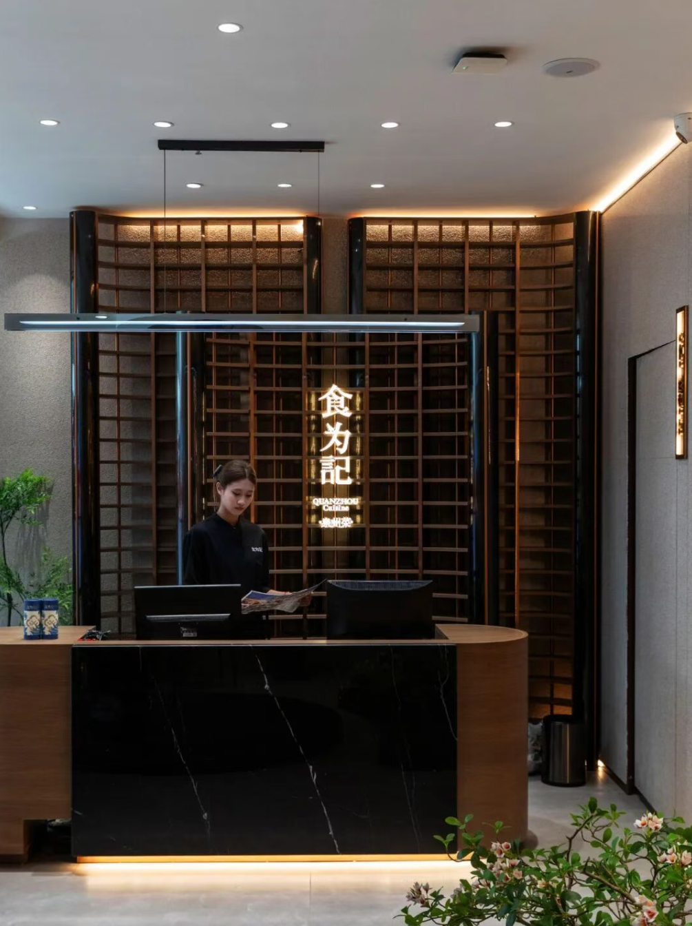 局部采用大理石纹理呼应泉州老厝的石板路意象,辅以灯笼式吊灯与镂空花窗,延续闽南文化空间中的“留白美学”。
