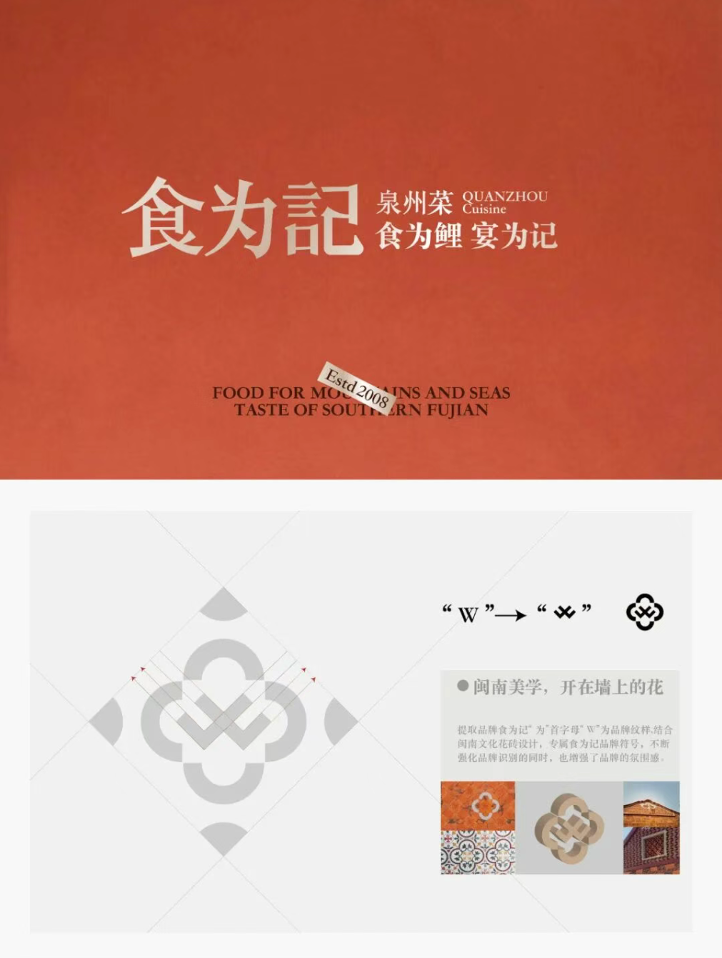 品牌名“食为记”中提取英文字母“W”作为视觉锚点,结合闽南民居中最具识别性的“花砖”图案,构建出品牌专属的“视觉纹样系统”。