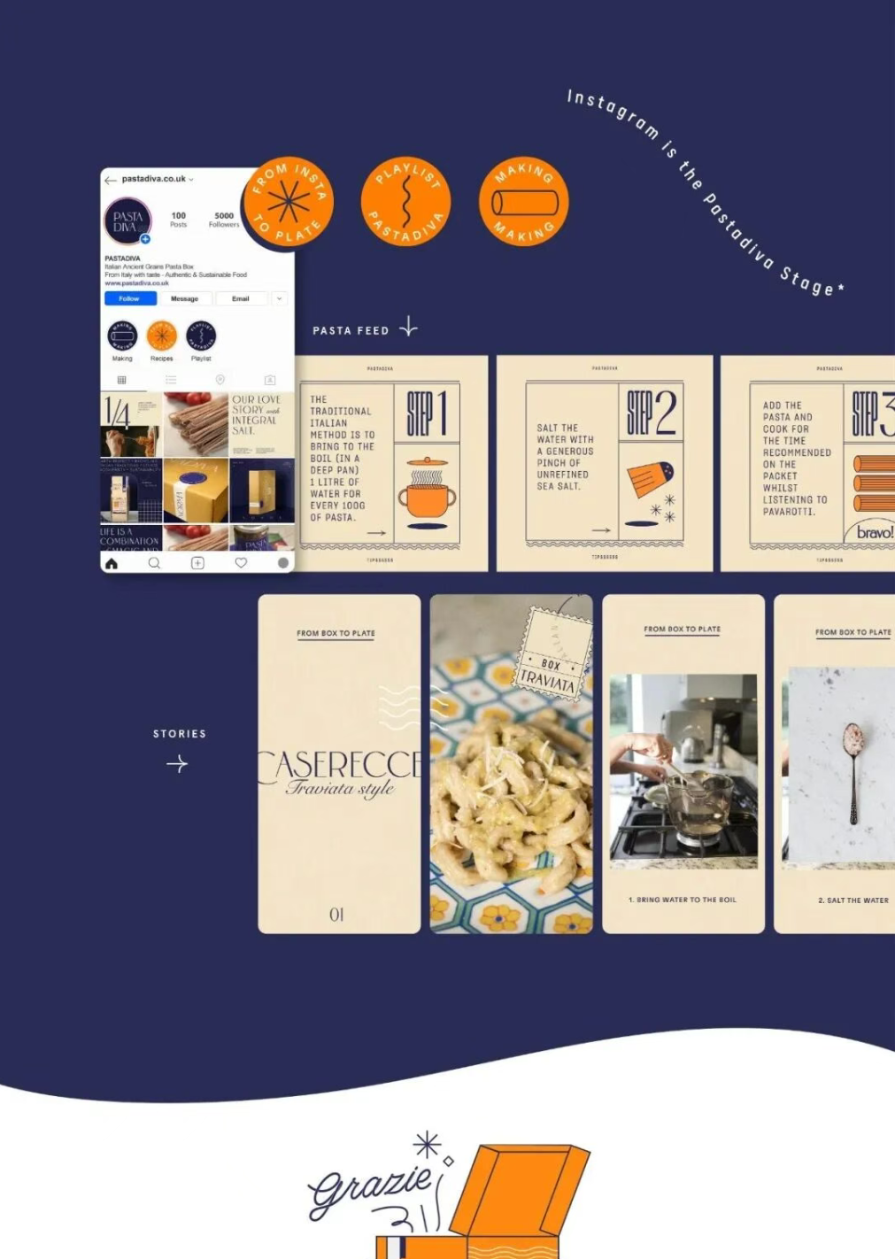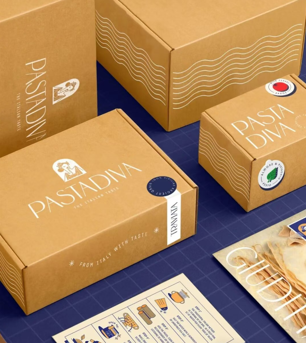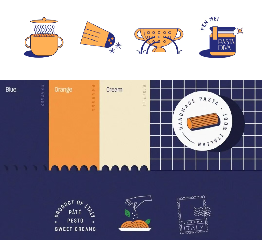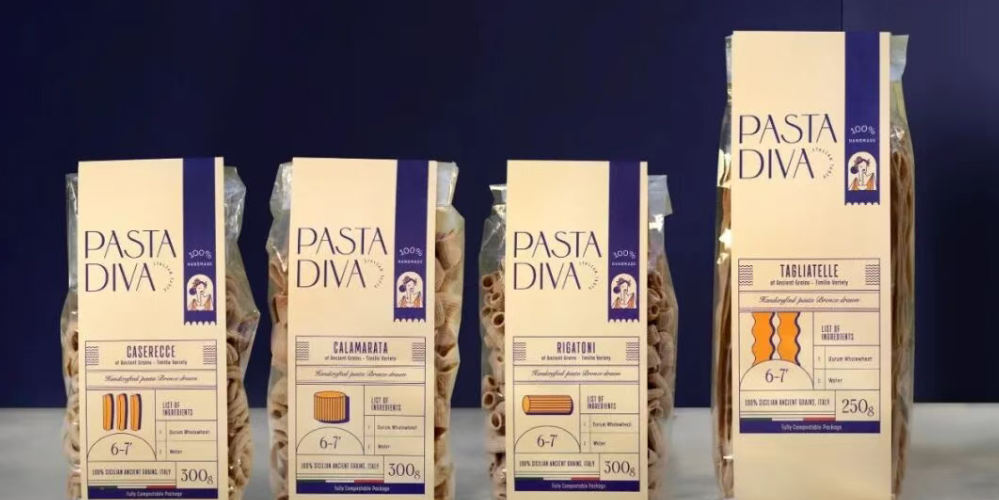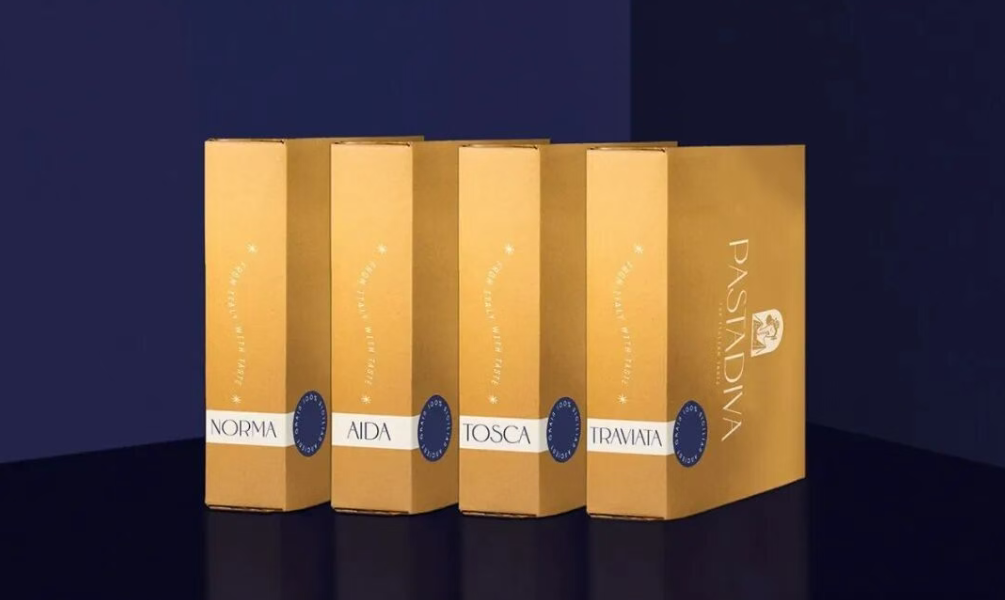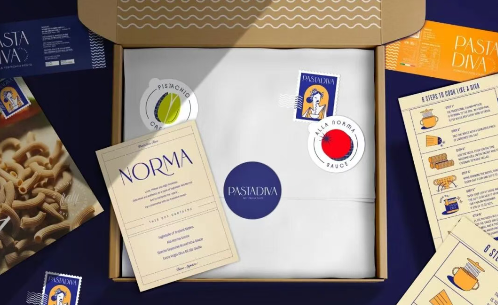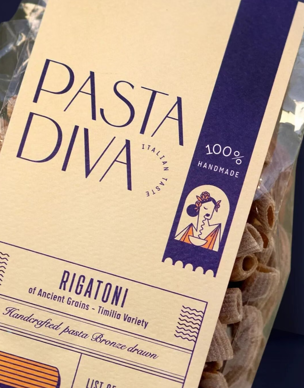 PASTADIVAT是一款即烹意面品牌,品牌标志的设计灵感来自意大利标志性的“歌剧女伶”。
