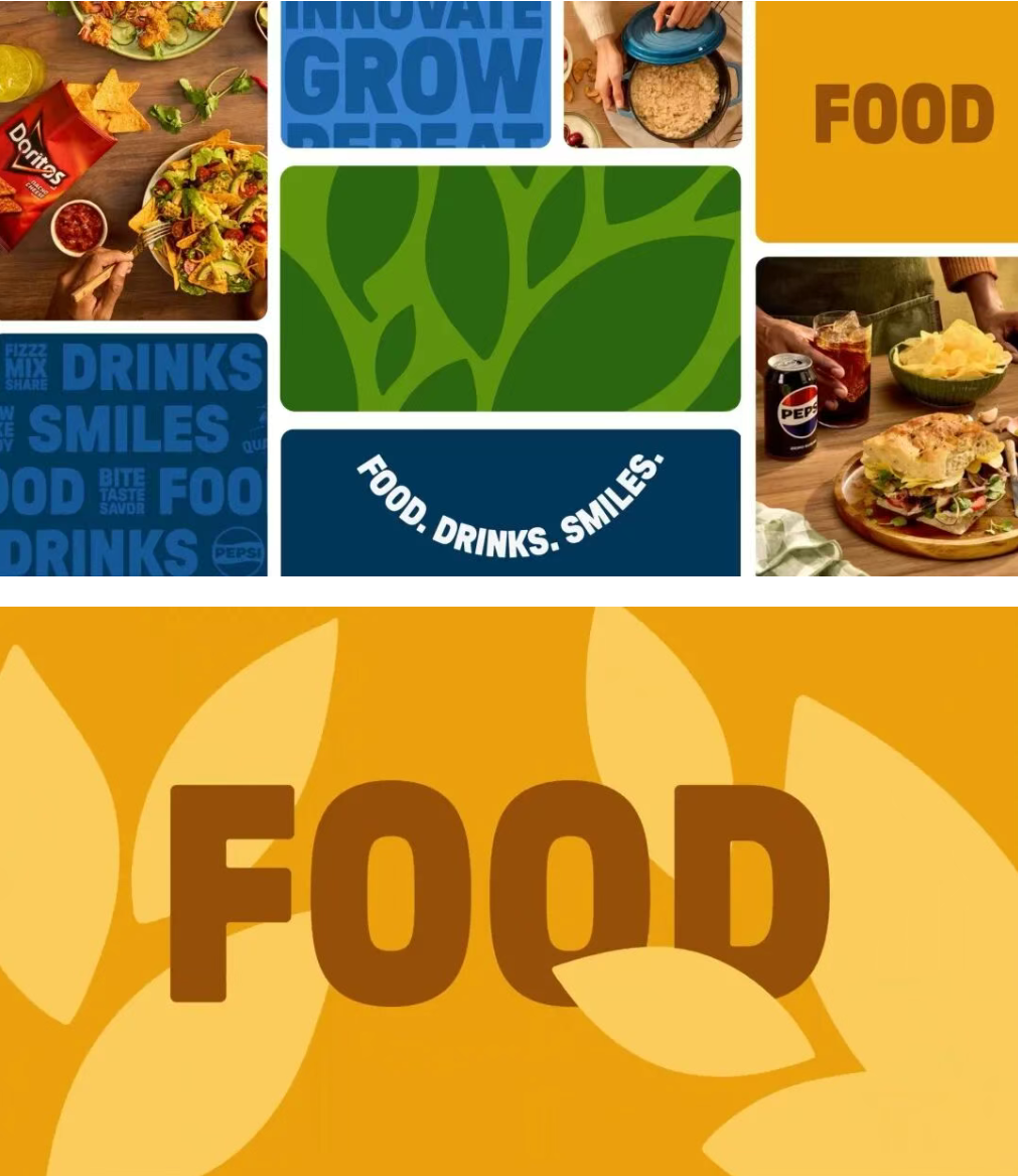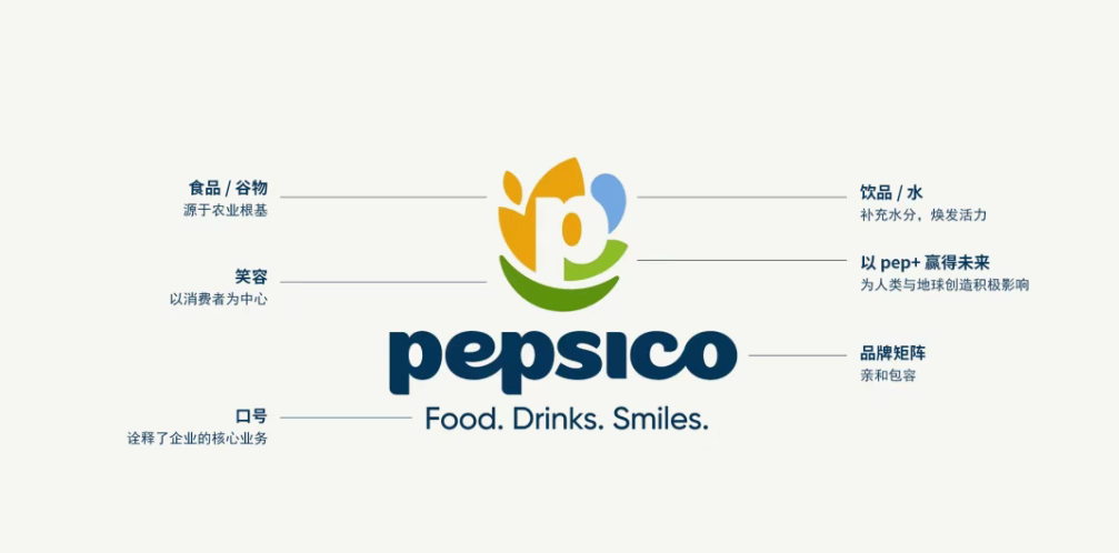 新LOGO在视觉层面有六个元素构成。图案中央镂空的「P」字母既是「PepsiCo」的首字母,也是品牌识别的核心符号。围绕这一核心的,是三种象征自然与生命循环的色块。橙色叶片代表粮食与农业,寓意品牌深深扎根于大地;蓝色水滴象征饮品与清爽,传递焕新与活力。