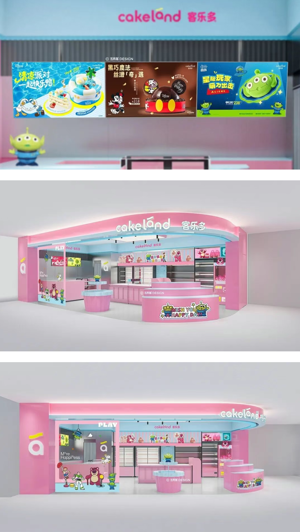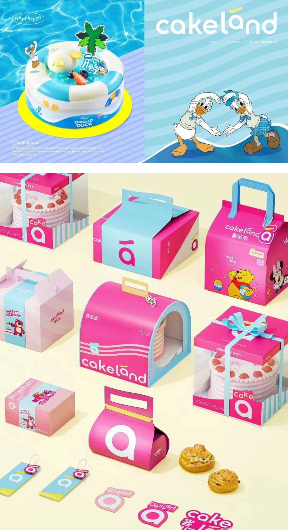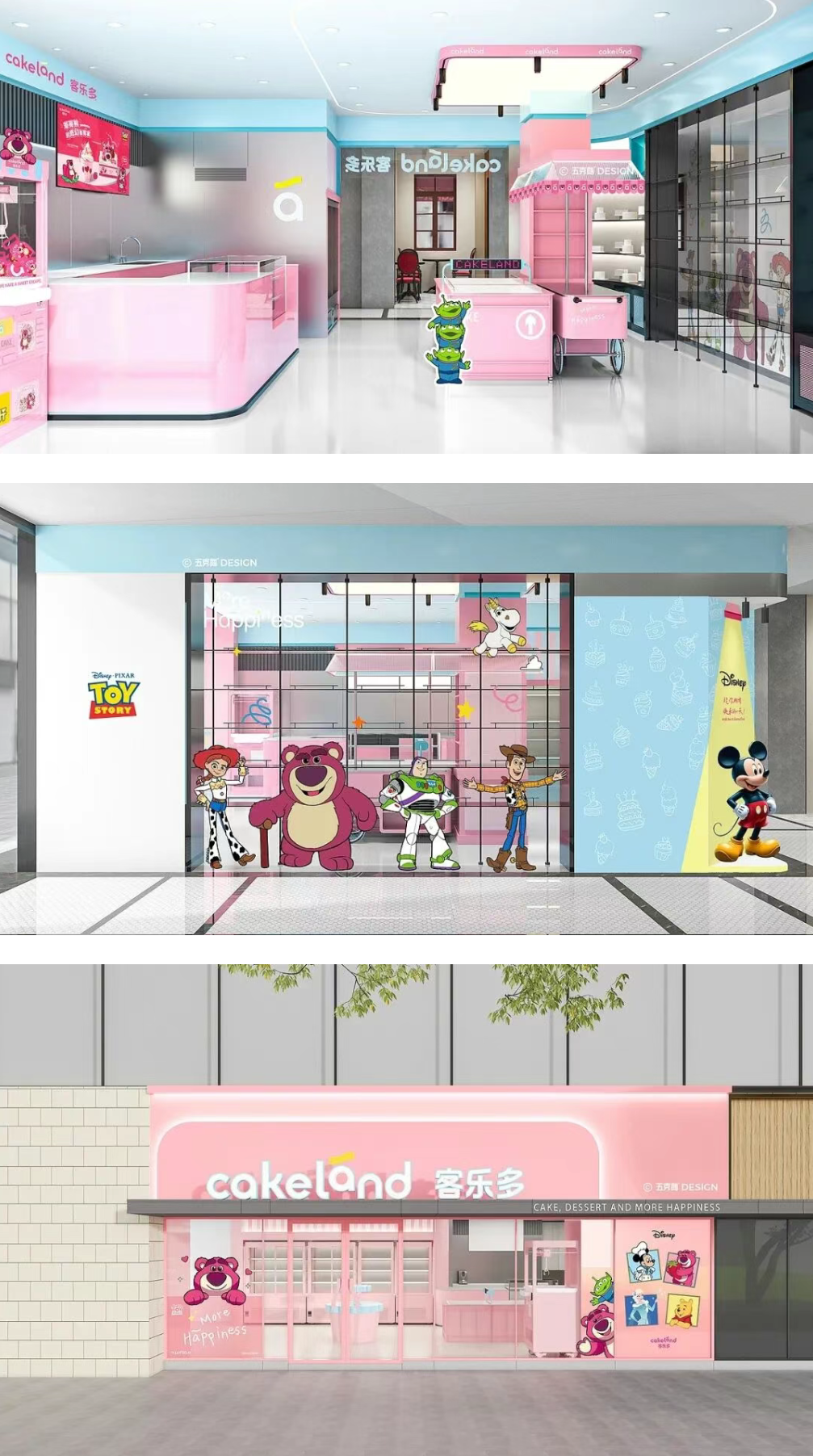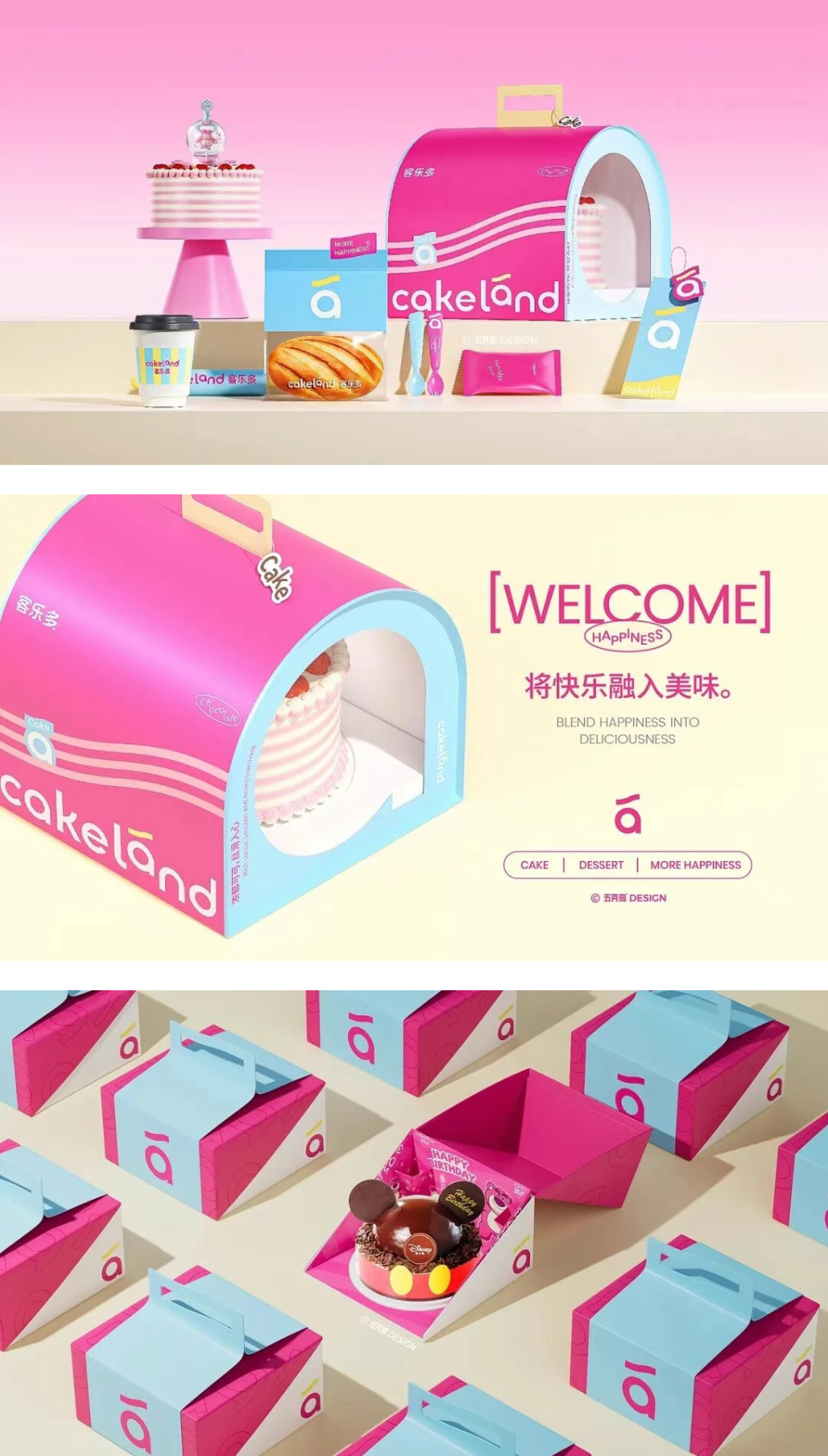 Cakeland客乐多的诞生,源于多方面的资源与机遇推动。自有烘焙工厂+迪士尼烘焙授权商,2大优势成为品牌差异化创新的底气。品牌定位「迪士尼IP赋能+美味创新」的蛋糕烘焙店,为都巿每个角落,带来如同童话般的快乐体验。因此,设计团队为cakeland打造多巴胺品牌风格,在传递快乐价值的同时,注入高级时尚基因,树立独一无二的品牌气质。