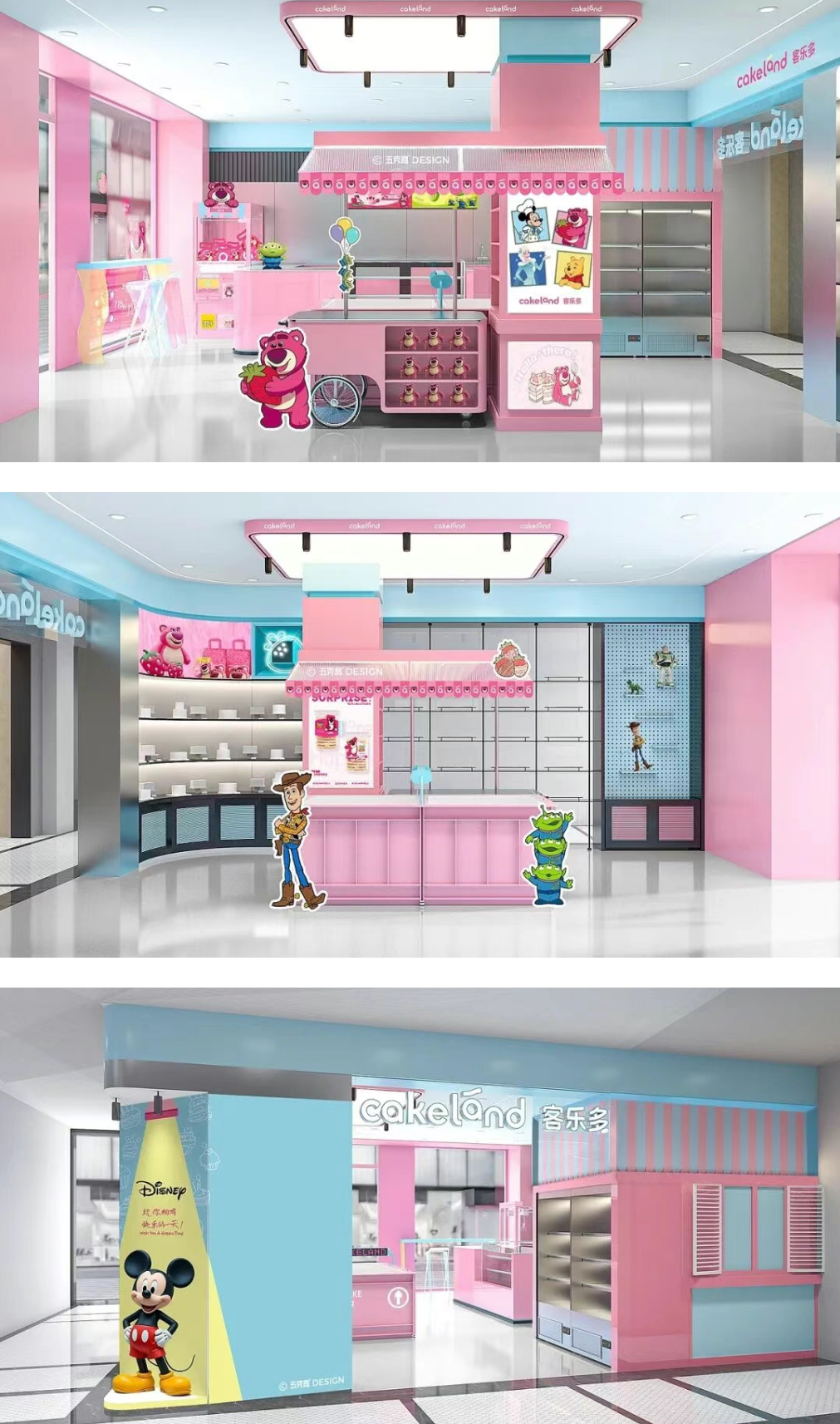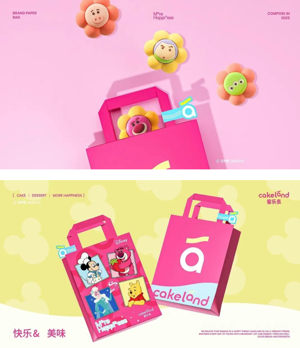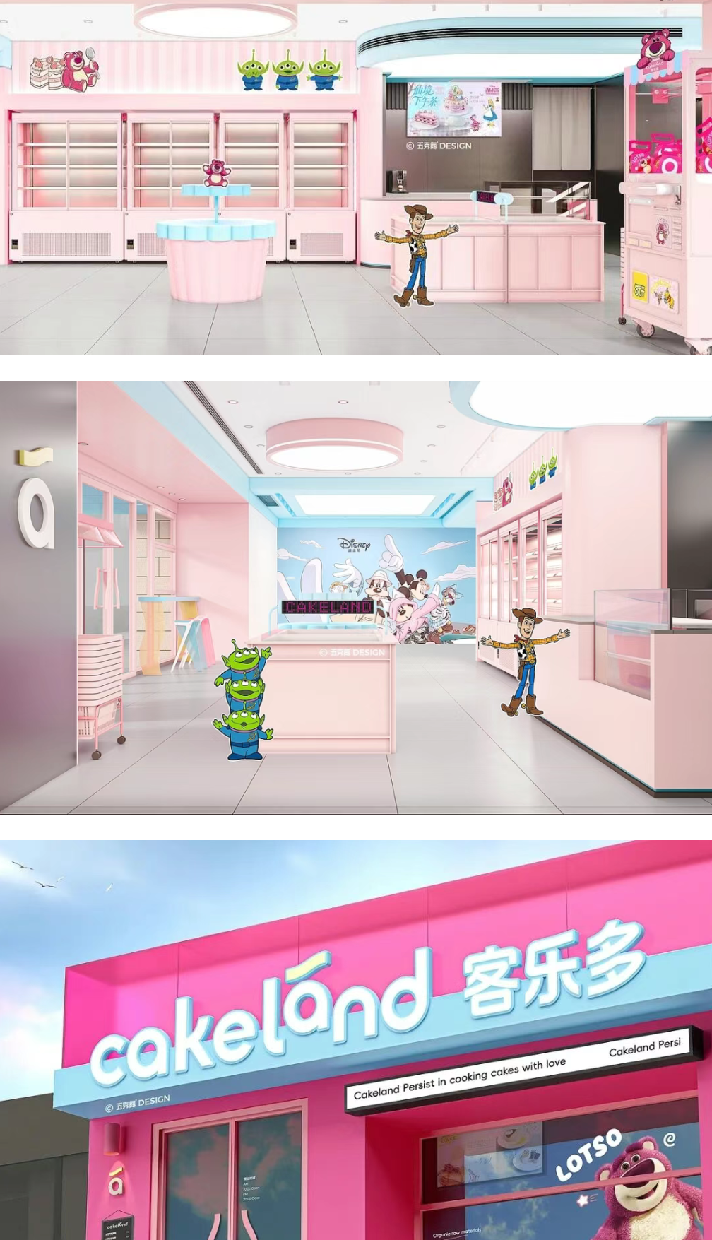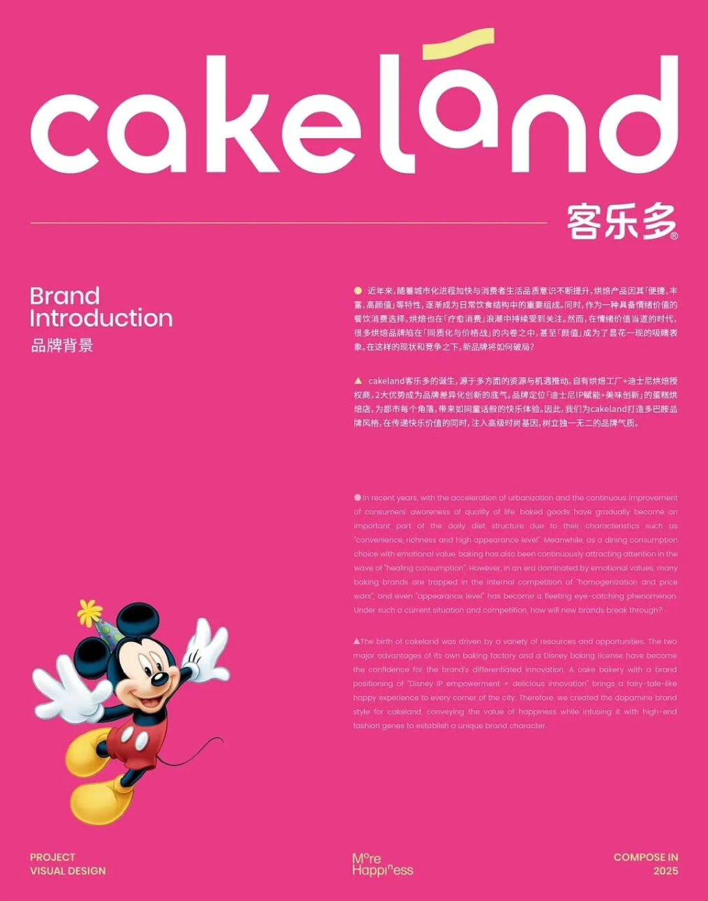 Cakeland客乐多的诞生,源于多方面的资源与机遇推动。自有烘焙工厂+迪士尼烘焙授权商,2大优势成为品牌差异化创新的底气。品牌定位「迪士尼IP赋能+美味创新」的蛋糕烘焙店,为都巿每个角落,带来如同童话般的快乐体验。因此,设计团队为cakeland打造多巴胺品牌风格,在传递快乐价值的同时,注入高级时尚基因,树立独一无二的品牌气质。