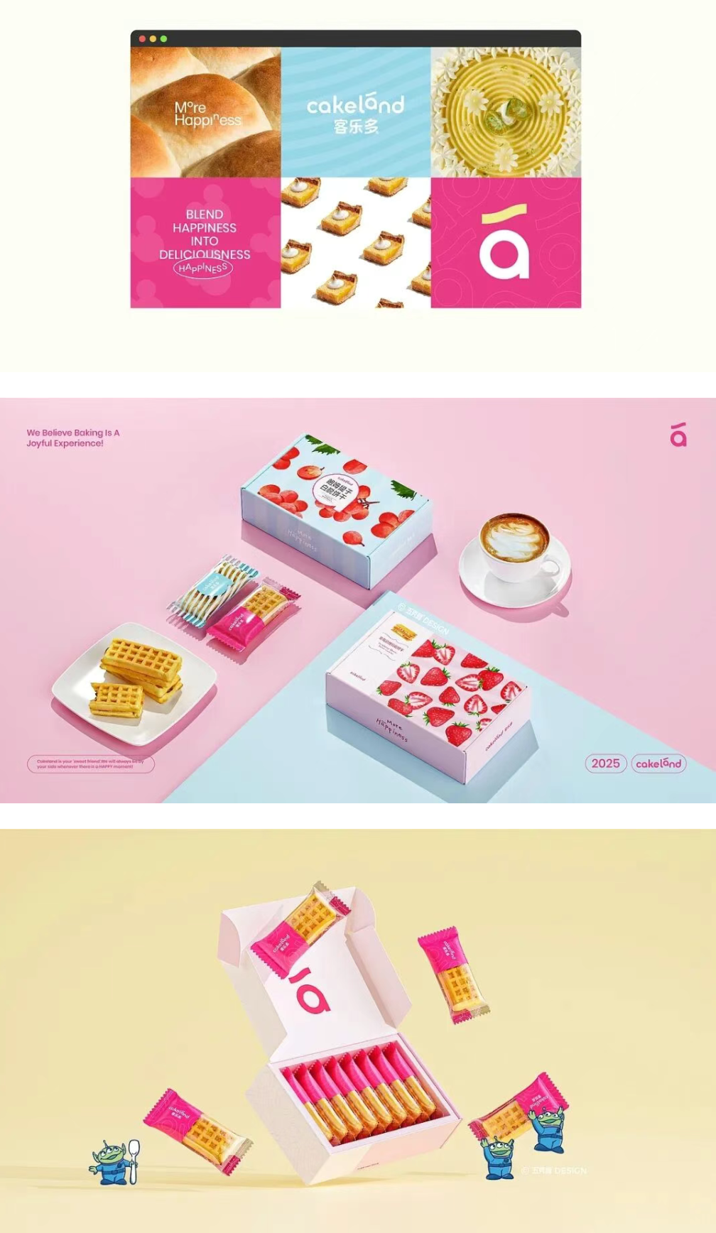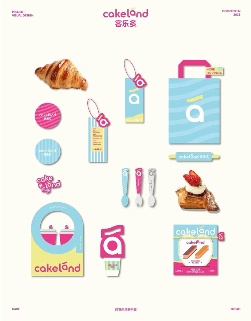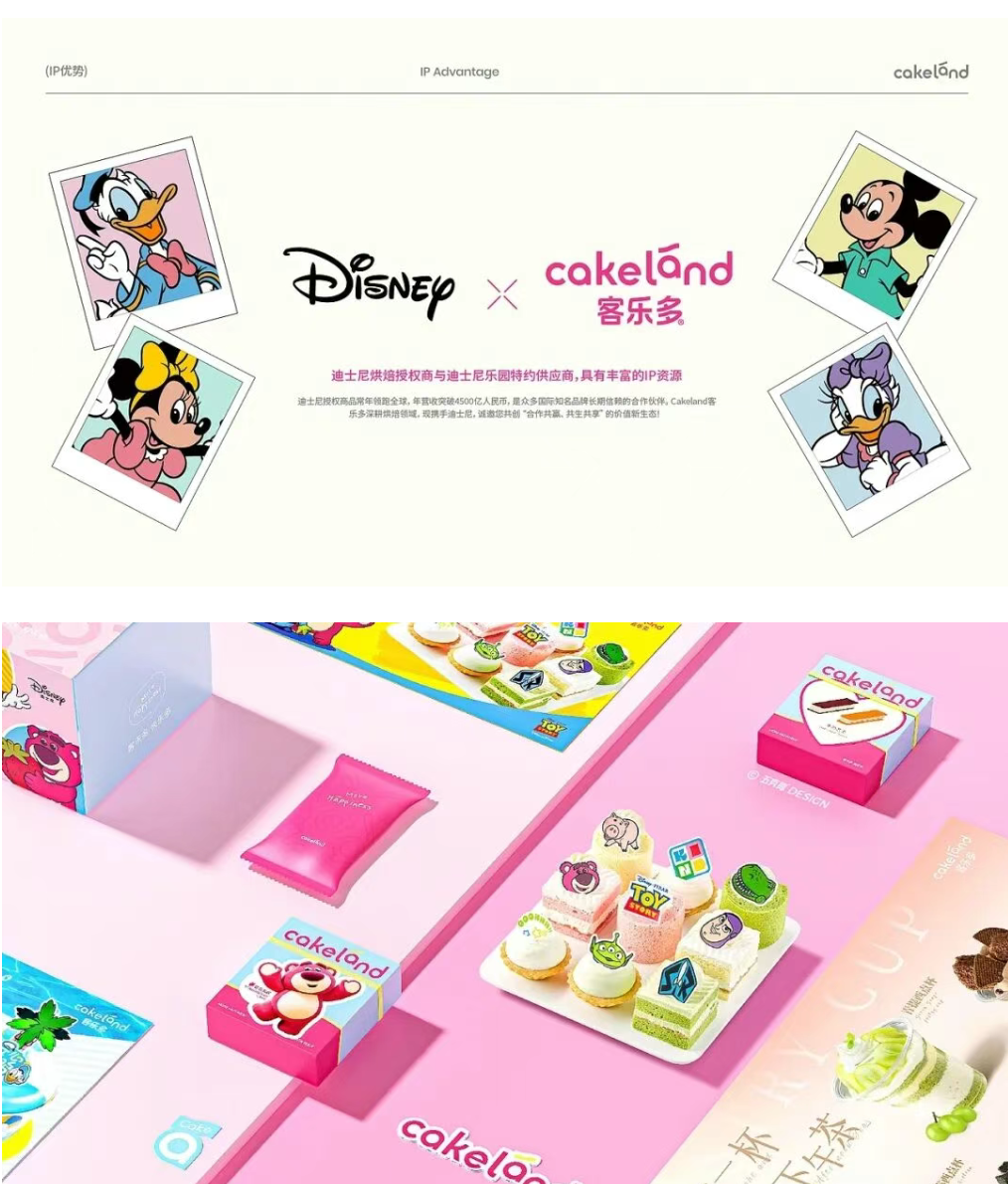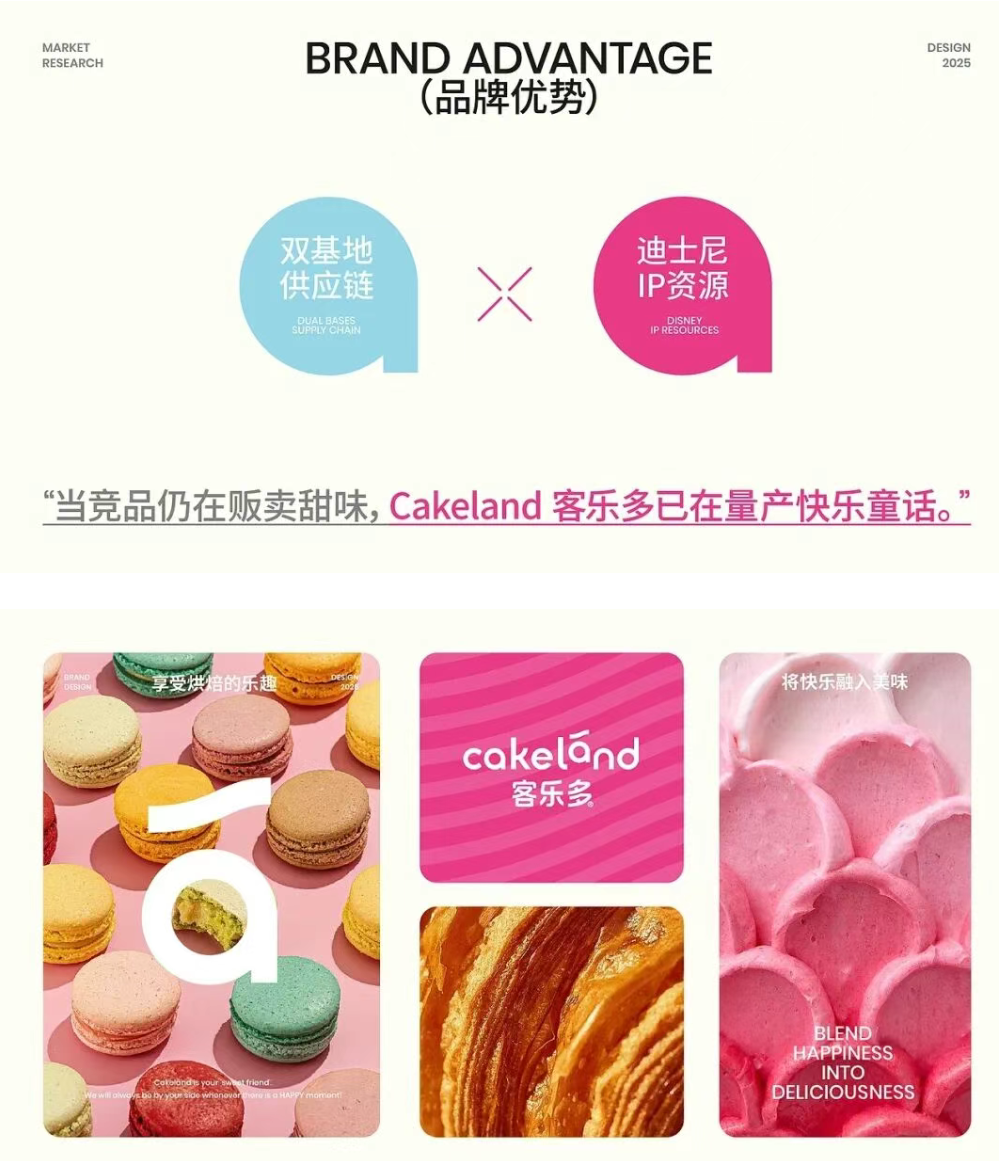 Cakeland客乐多的诞生,源于多方面的资源与机遇推动。自有烘焙工厂+迪士尼烘焙授权商,2大优势成为品牌差异化创新的底气。品牌定位「迪士尼IP赋能+美味创新」的蛋糕烘焙店,为都巿每个角落,带来如同童话般的快乐体验。因此,设计团队为cakeland打造多巴胺品牌风格,在传递快乐价值的同时,注入高级时尚基因,树立独一无二的品牌气质。