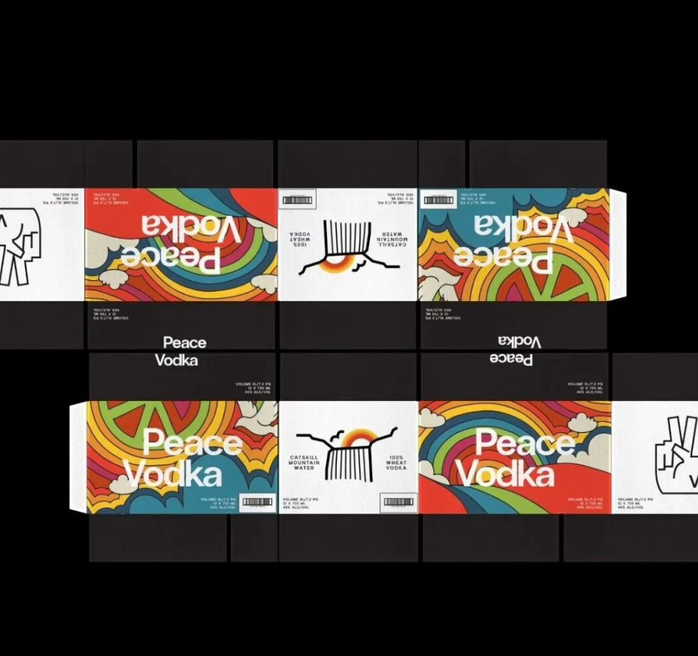 Peace Vodka的设计风格摒弃了烈酒常见的黑金、极简风,反之以高饱和度的迷幻色彩构建品牌强记忆点,使其产品在货架上能瞬间脱颖而出。