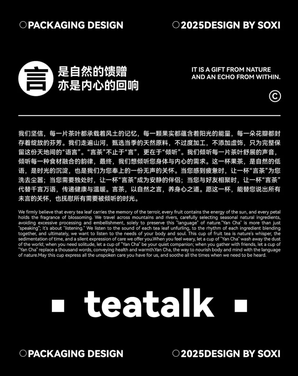 “言茶”不止于“言”,更在于“倾听”。品牌倾听每一片茶叶舒展的声音,倾听每一种食材融合的韵律。言茶,以自然之言,养身心之道。愿这一杯,能替您说出所有未言的关怀,也抚慰所有需要被倾听的时光。