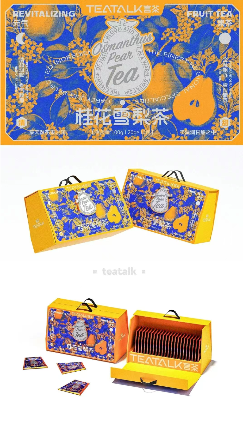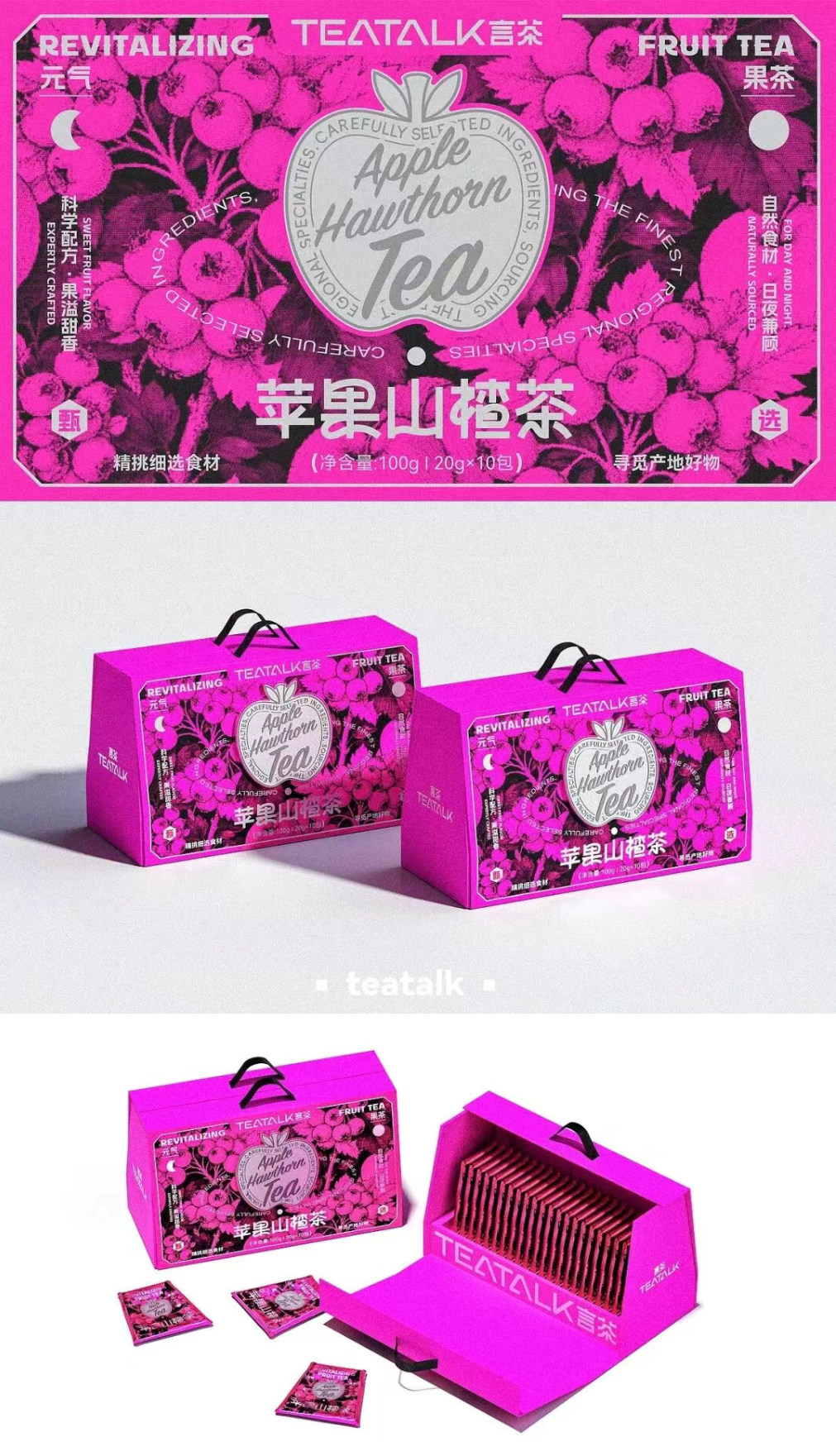 包装方面,整体以玫红、亮黄等高饱和色彩为主色调,跳脱出传统养生茶的素雅色调,精准击中年轻消费者对潮流感与天然感的双重需求。主视觉则将苹果山楂、桂花雪梨等食材以写实插画形式铺满包装,直挂传递产品真材实料的优势,同时通过丰富的视觉层次营造出美式复古的潮流质感,模糊“养生”与“时尚”的边界。