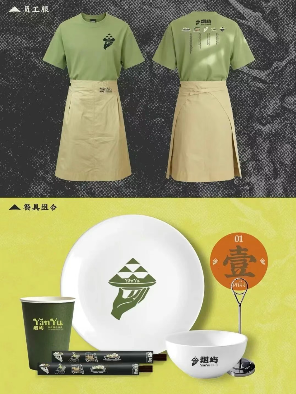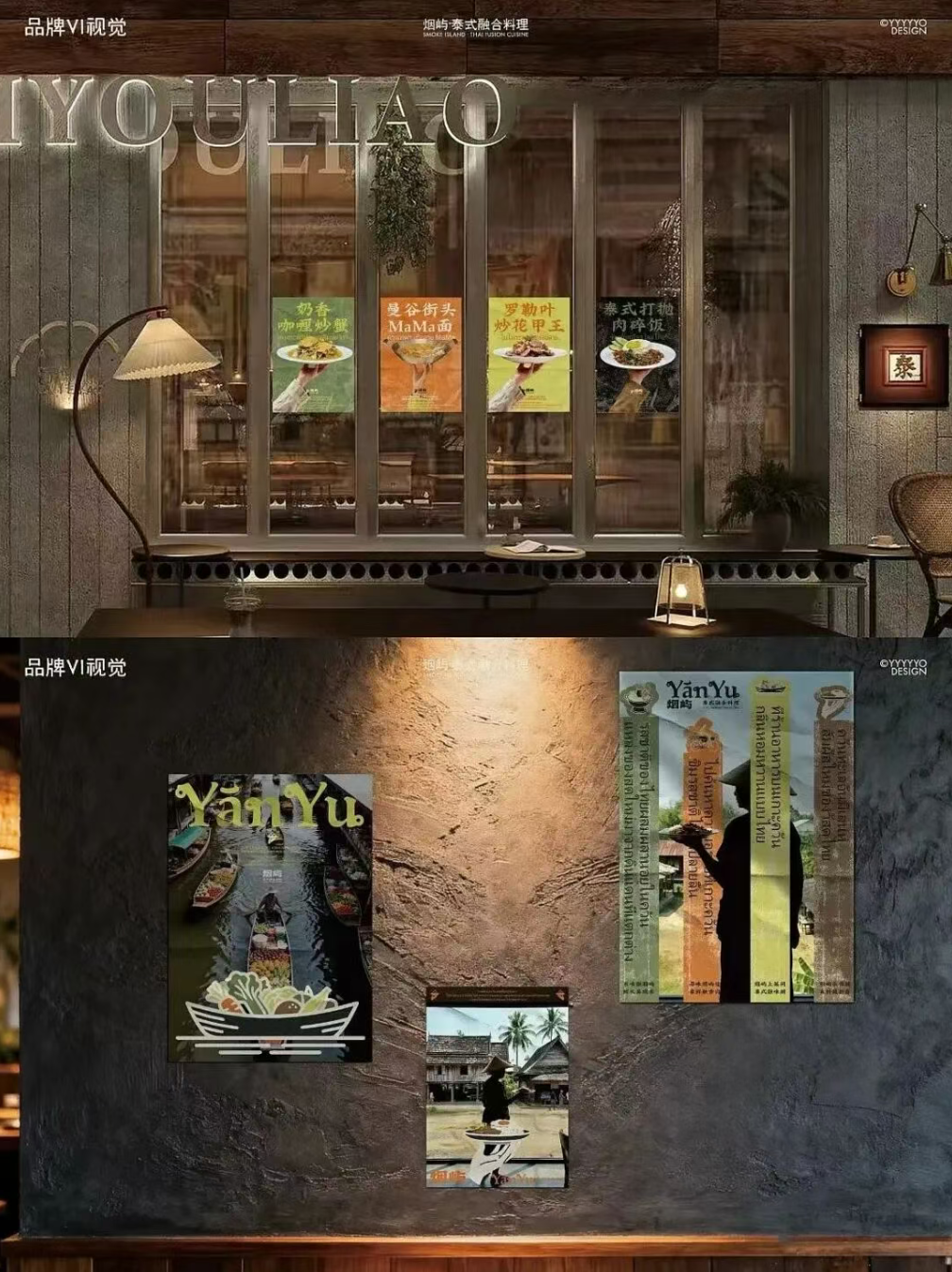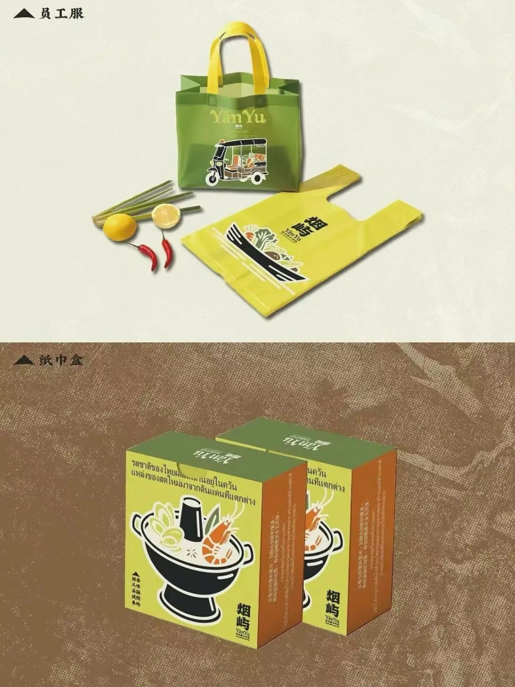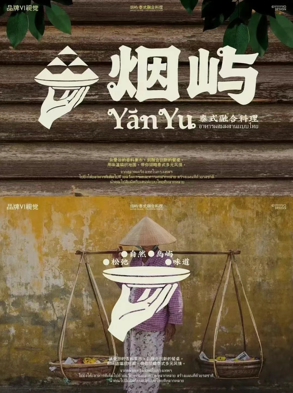 这款 “烟屿” 泰式融合料理的视觉设计,以 “自然岛屿 + 泰式烟火气” 为核心脉络,将品牌气质具象为一套完整且有记忆点的视觉语言。