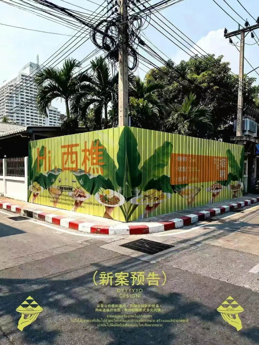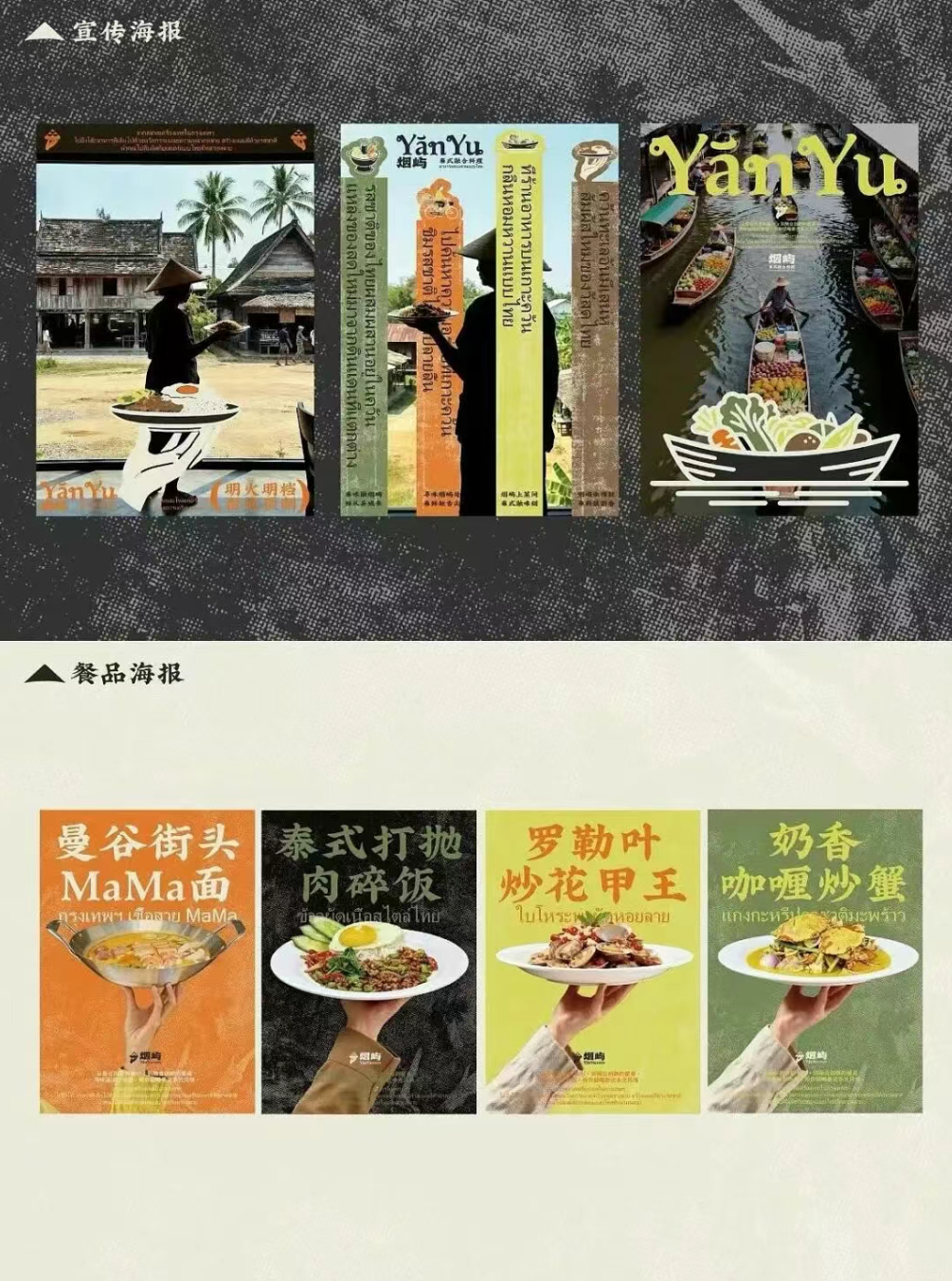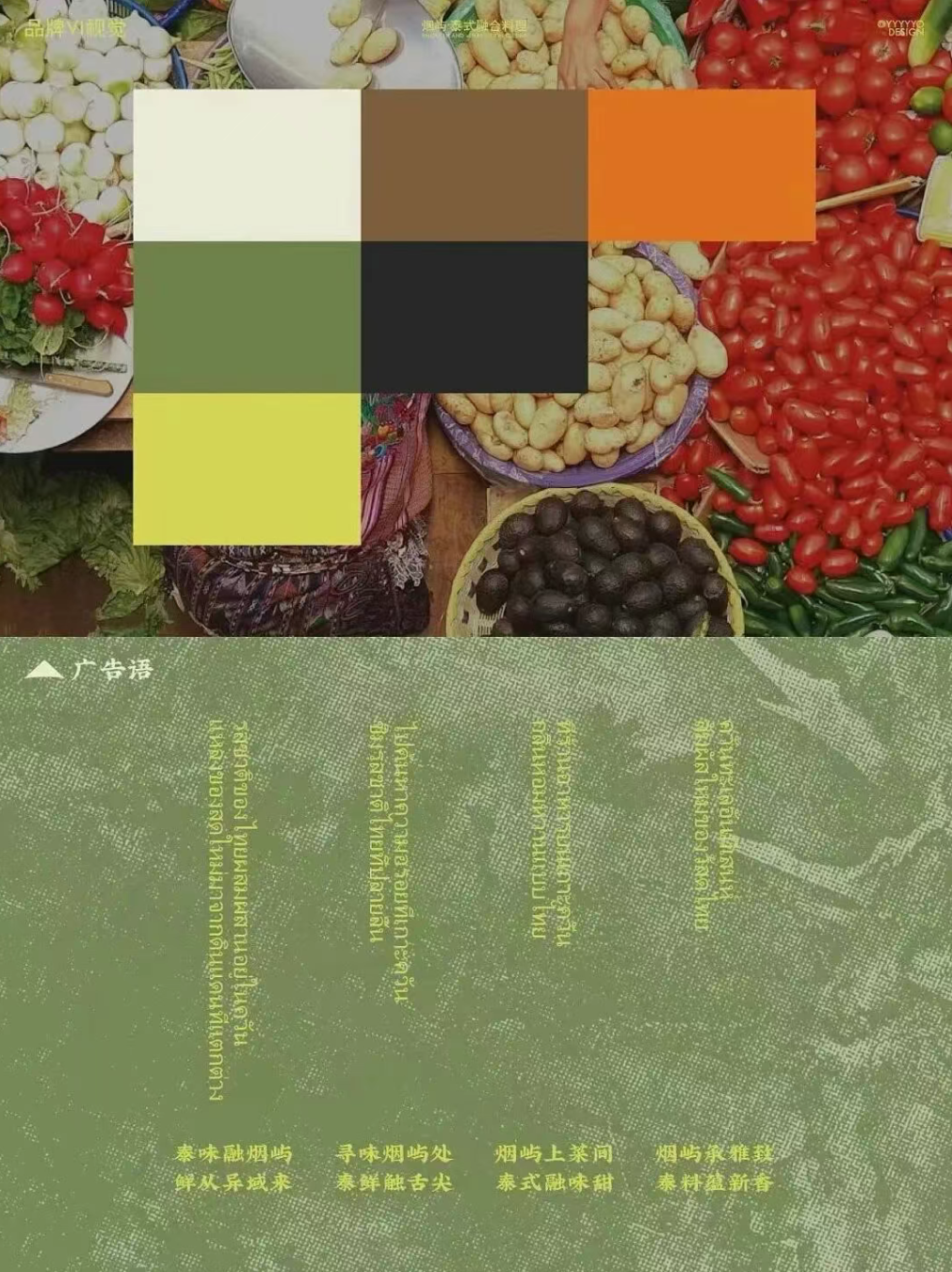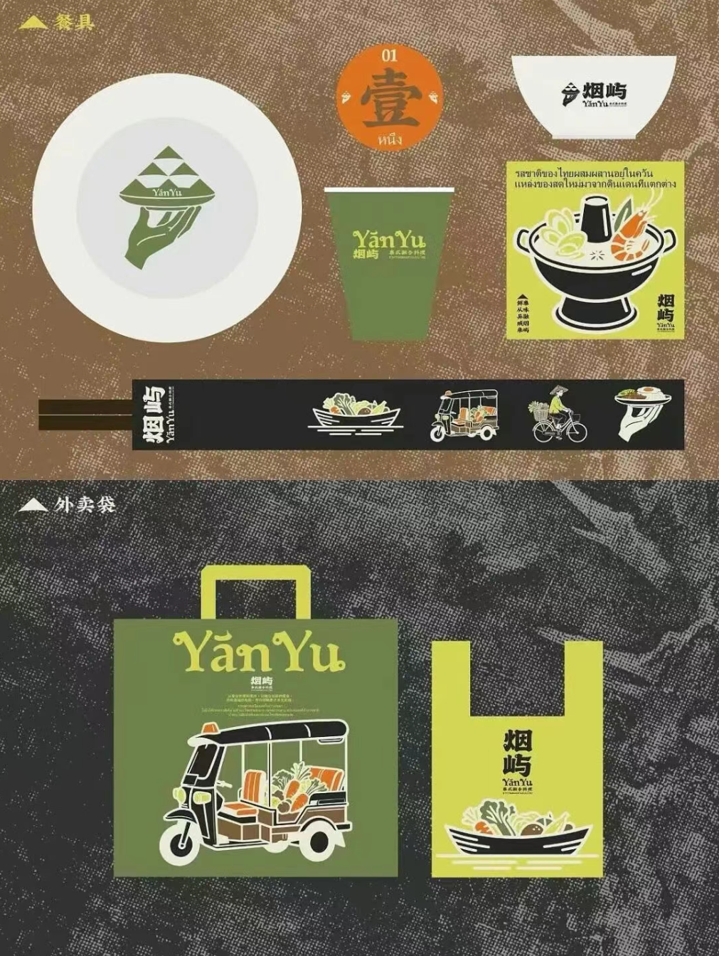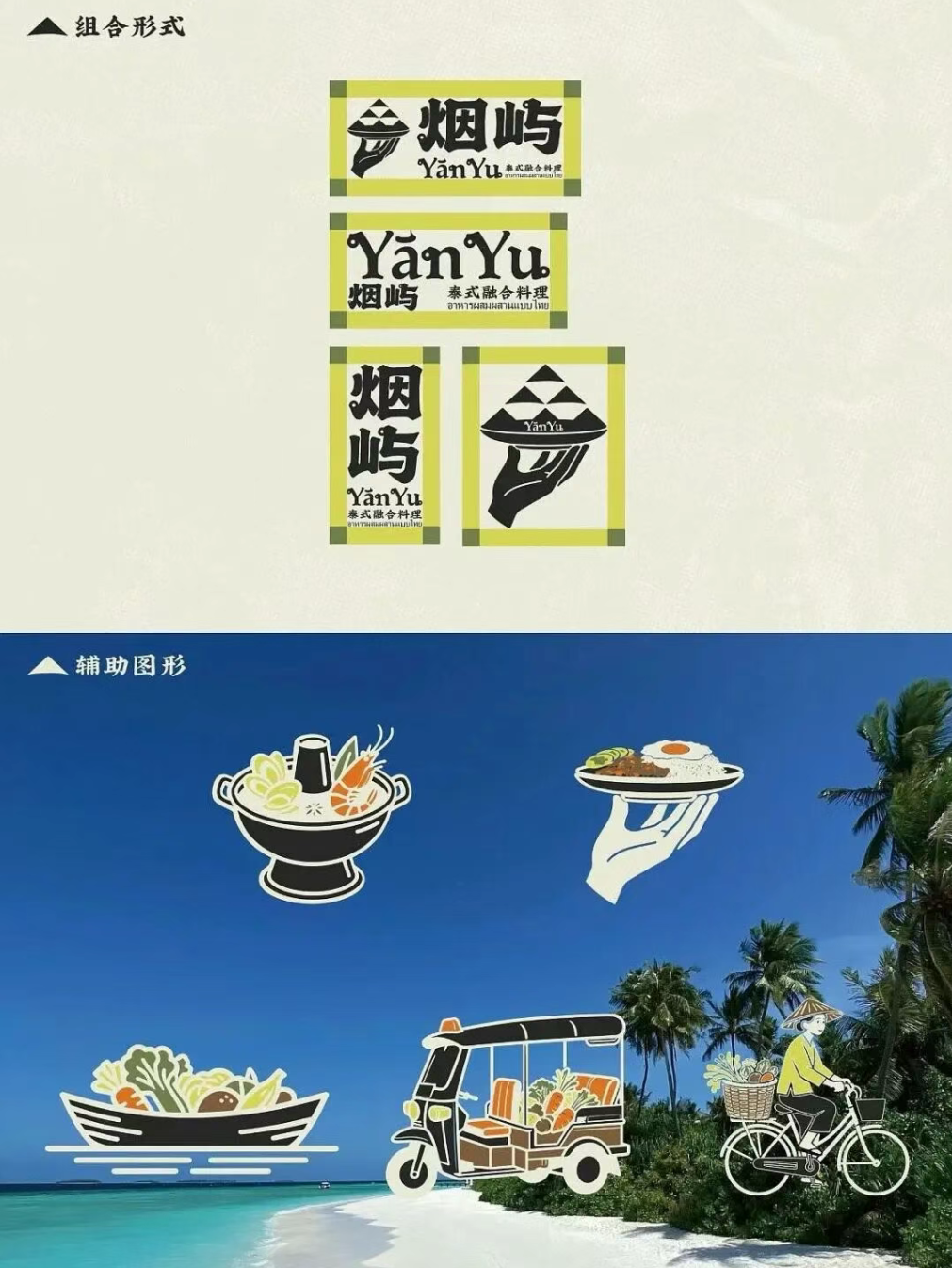 从 LOGO 里托着泰式餐食的手与岛屿形态的结合,到辅助图形里的嘟嘟车、菜船、市集摊贩等泰式生活符号,再到以黄绿、棕褐为主的大地色系,既锚定了泰式的地域属性,又通过复古质感的肌理与现代简约的线条,平衡出融合料理的松弛与精致。