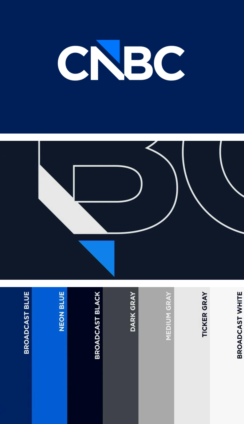CNBC 的新标志去除了经典的孔雀图案,仅用大写的CNBC无衬线字体呈现,其中N字母的上方插入了一个蓝色的三角形。新标志既能够体现 CNBC 在金融领域的专业知识,又对CNBC在 1989 年的原始标志进行了致敬。