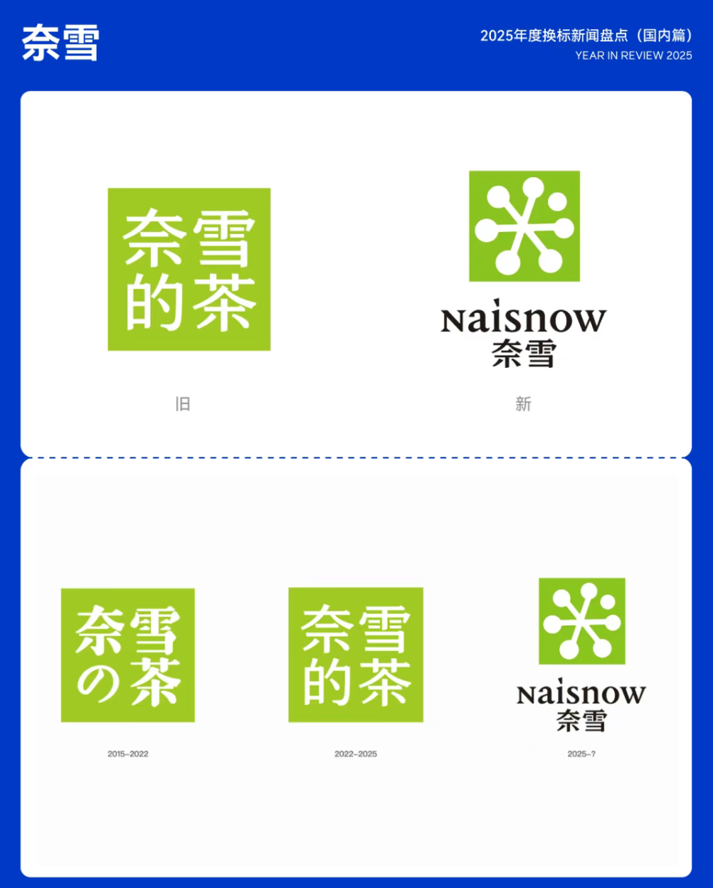5月7日,奈雪在成立十周年之际启动品牌全面升级,发布全新 LOGO 与英文名「Naìsnow」,并将品牌名称由「奈雪的茶」简化为「奈雪」。新 LOGO 以雪花与果实为核心元素,延续绿色主色调,传达自然与健康理念;其中「Naì」象征自然、艺术与想象三大品牌价值,「snow」呼应雪花意象,体现品牌对自然纯粹的追求。04.奈雪