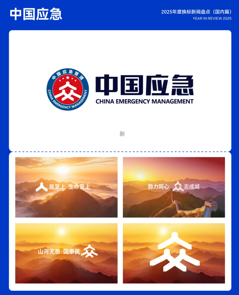 2025年3月13日,中华人民共和国应急管理部正式发布了应急管理系统官方LOGO。LOGO以「人」字为核心设计元素,强调人民至上、生命至上的理念,并通过抽象方式呈现了「众」字和「安」字,象征着众志成城守护国泰民安的决心,体现了应急管理部门的使命。26.中国应急