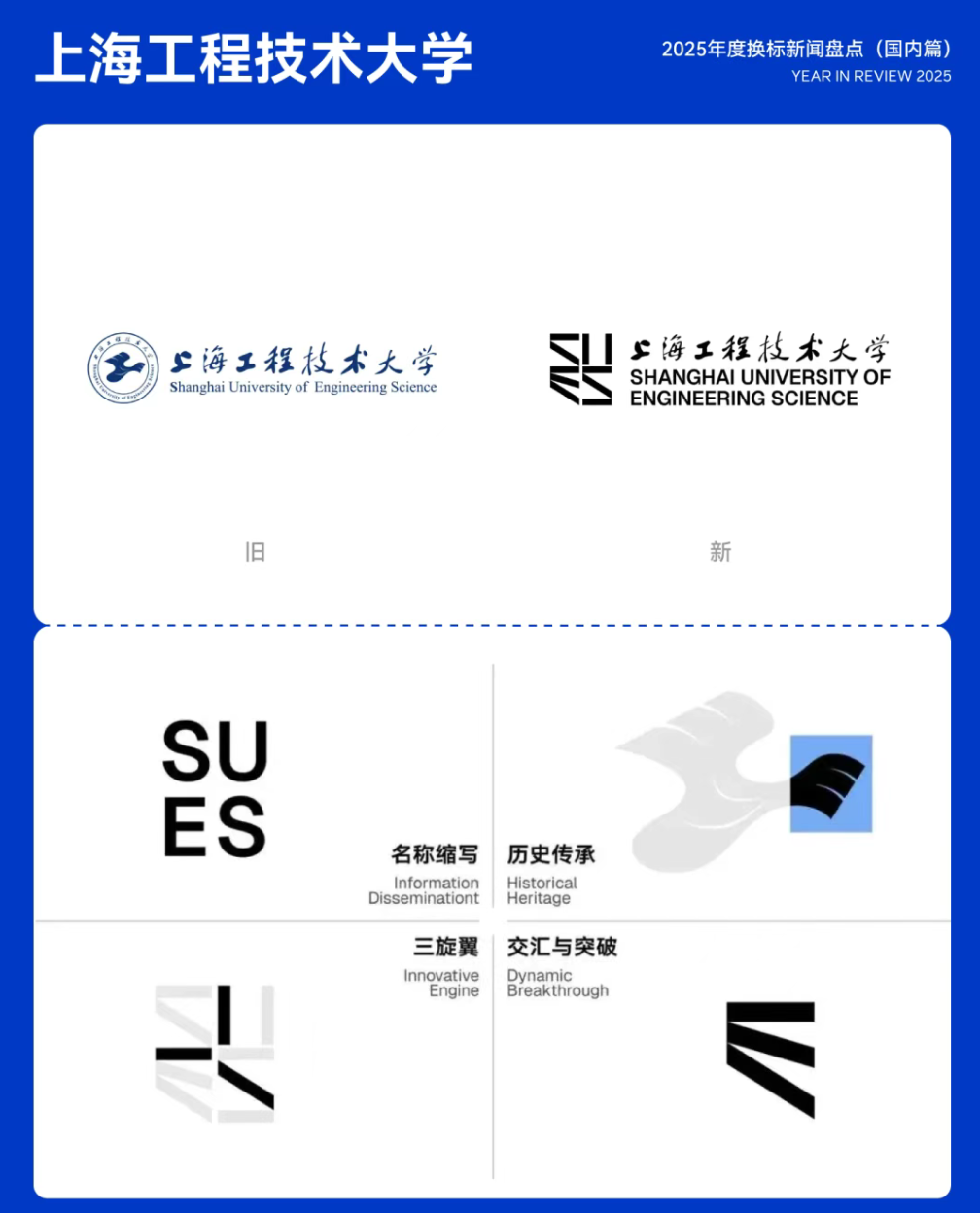 2025年10月23日,上海工程技术大学正式发布全新视觉识别系统。新LOGO突破传统设计范式,以开放姿态回应面向未来的发展方向,其核心元素为「一」既象征万物之始,也代表秩序、精确与力量。通过水平与倾斜线条的组合构成英文缩写「SUES」,整体呈现富有动感的视觉形态,体现学校持续突破的活力,以及开放、融合、进取的核心价值。12.上海工程技术大学