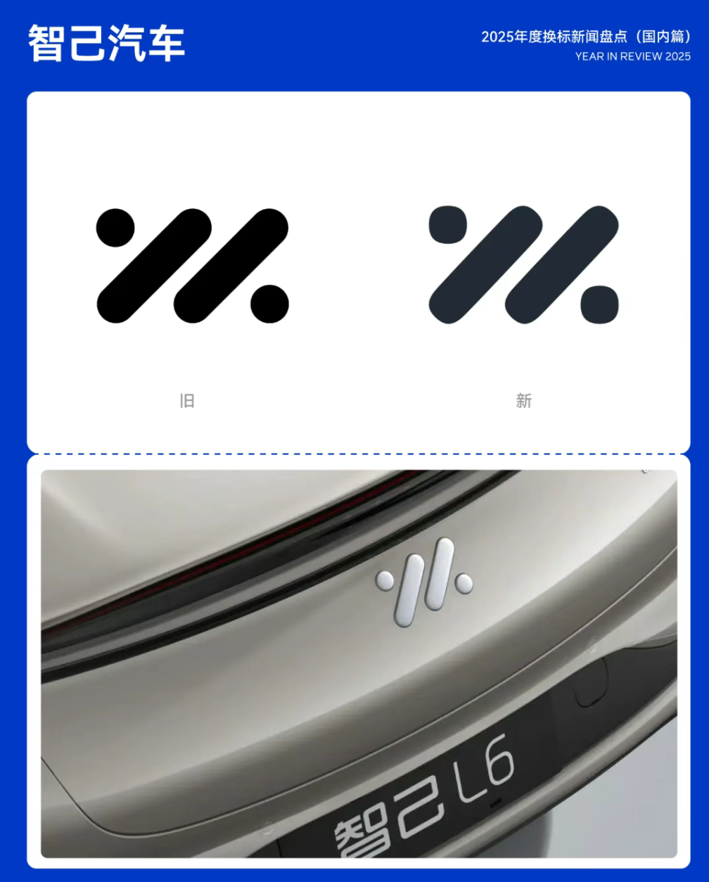 今年4月初,智己汽车对品牌 LOGO 进行升级。新版 LOGO 相较原有标识调整幅度有限,整体仍延续以数字「0」与「1」为核心的设计理念,在保持品牌识别连续性的同时进行细节优化。21.智己汽车