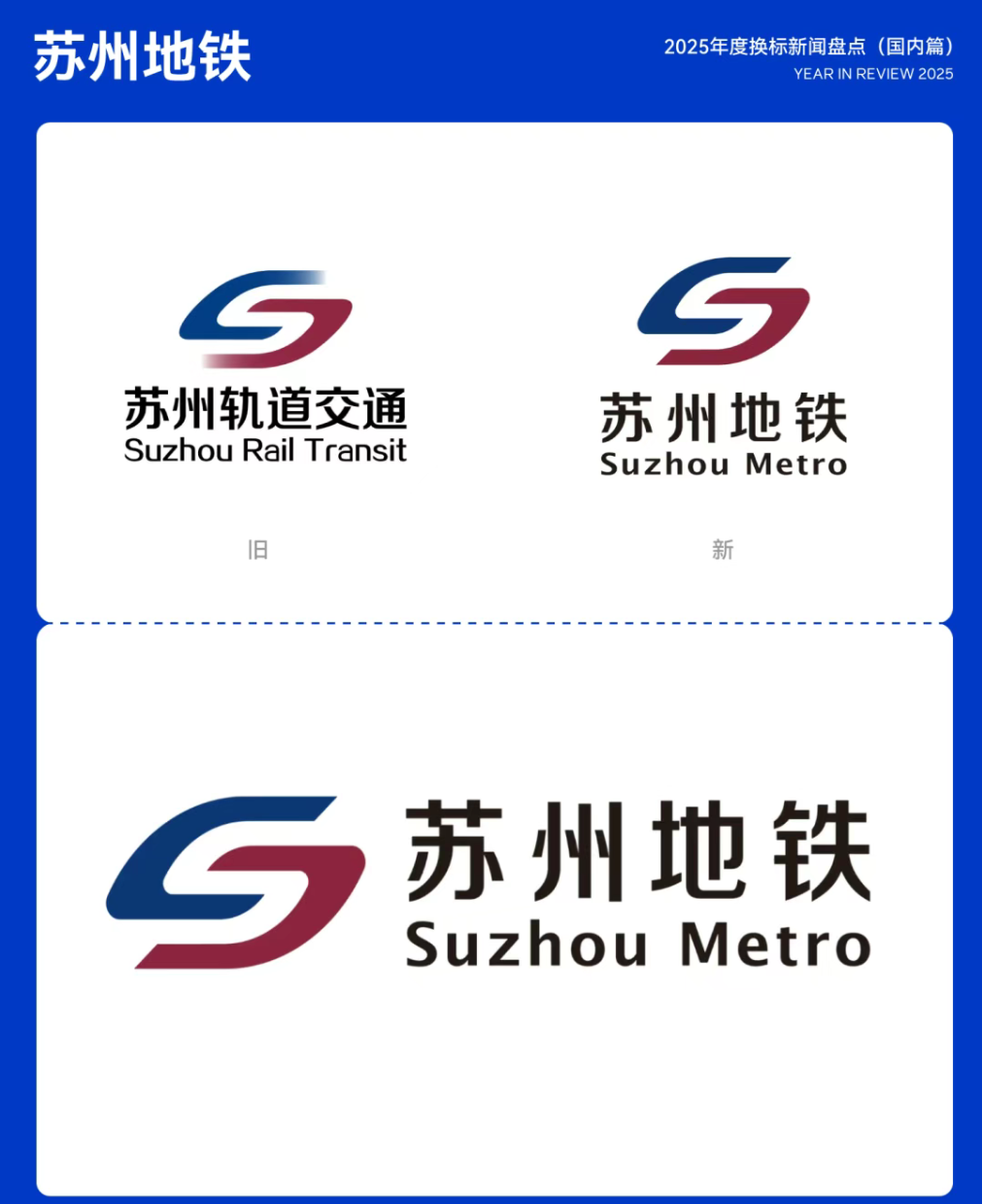 3月17日,苏州轨道交通正式更名为「苏州地铁」,并同步优化地铁LOGO。新版 LOGO 在保留原有识别基础上进行细节升级,去除了「S」顶部与底部的渐变效果,改为蓝、红两色呈现,同时略微收窄图形宽度,使整体更紧凑协调,进一步提升了LOGO的清晰度与可读性。