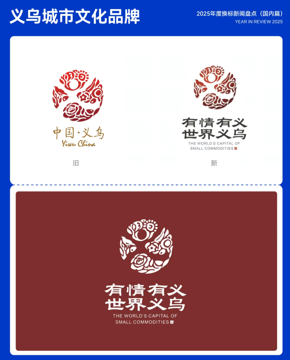 9月19日,义乌正式发布城市文化品牌LOGO「有情有义 世界义乌」。该LOGO图形沿用 2017 年发布的义乌城市形象 LOGO。此前,义乌于 2016 年 7 月面向全市启动城市形象LOGO投票及口号公开征集,并于 2017 年初正式确定并发布城市 LOGO。19.义乌城市文化品牌