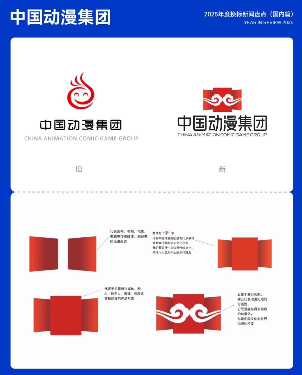 2025年9月28日,中国动漫集团正式发布全新品牌LOGO。新 LOGO 凝练了集团「以人民为中心、以中华文化为根与魂」的创作理念,象征中国动漫以多样化、潮流化的姿态融入世界,成为中外文化交流的重要桥梁。11.中国动漫集团