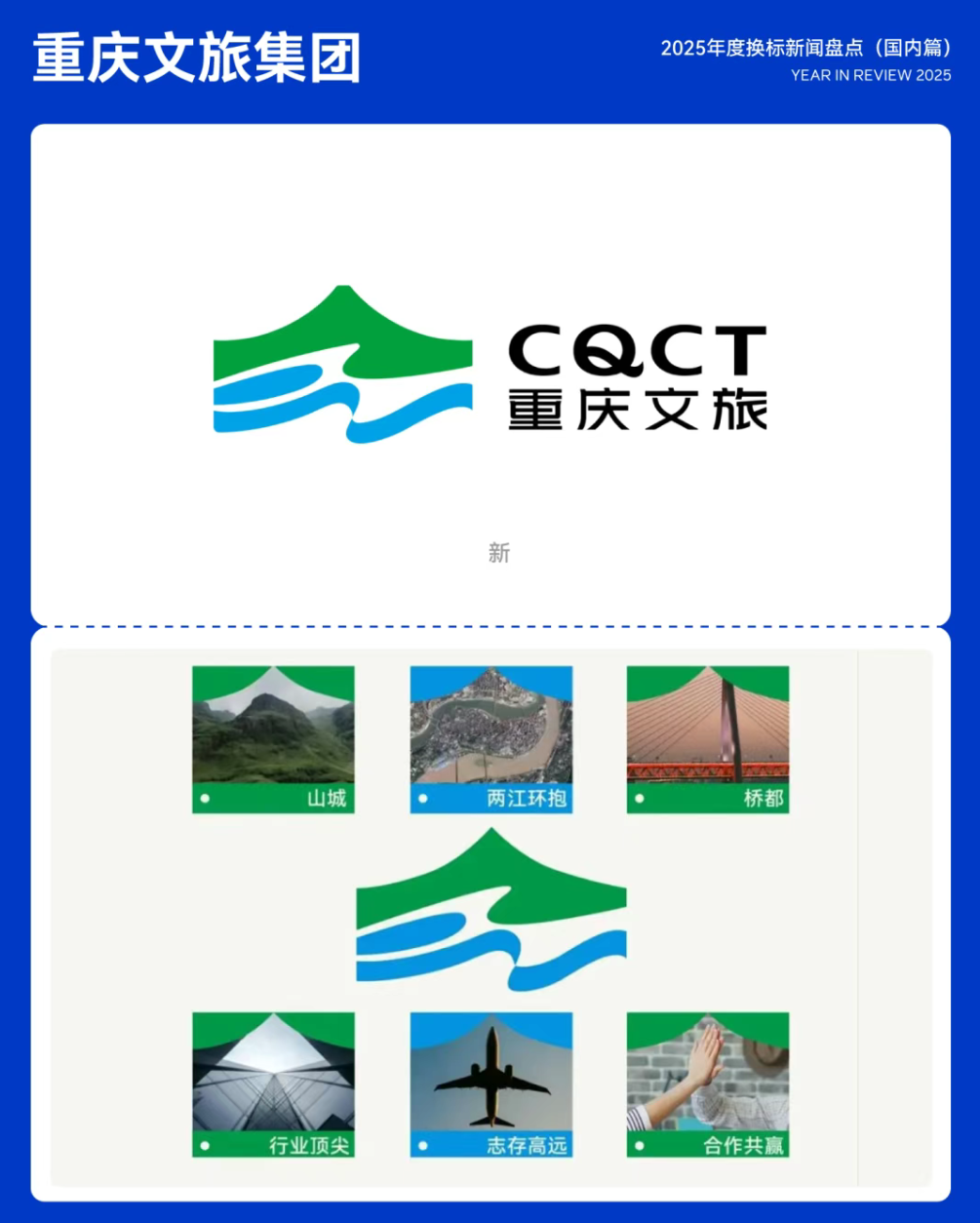 2025年年初,重庆文旅集团启用全新企业LOGO。新 LOGO 以重庆独特的「山水文化」为设计源点,通过简约而富有立体张力的造型,将城市特征凝练进视觉符号之中。其中水波弧线作为核心元素,既呼应「两江环抱」的地理格局,也象征重庆鲜明的城市精神与独特魅力。30.重庆文旅集团