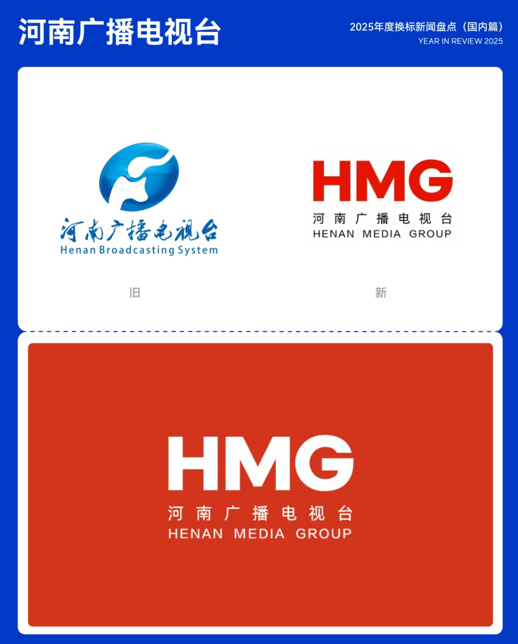 2025年7月24日,河南广播电视台正式发布全新台标「HMG」。新LOGO以「Henan Media Group」首字母缩写为核心,将现代传媒的科技属性与中原文化意象相融合。整体造型富有未来感与动感,主色选用中国传统色彩「丹雘红」,色泽沉稳而典雅,并结合层次丰富的动态光影效果,展现广电行业的技术力量,诠释「新时代·新文化·新传播」的品牌主张。08.河南广播电视台