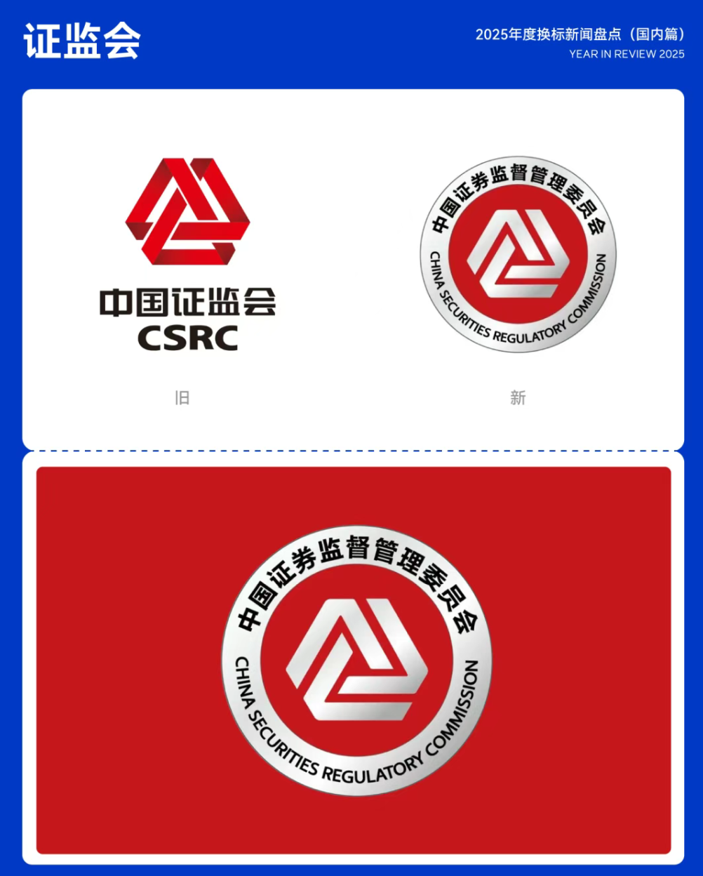 2025年6月30日,中国证券监督管理委员会通过官网及官方新媒体平台更新机构LOGO。原自 2012 年启用、由三个红色三角形构成的「公」字形 LOGO,被替换为由三个「V」形图案环绕组成的圆形徽章式LOGO。06.证监会