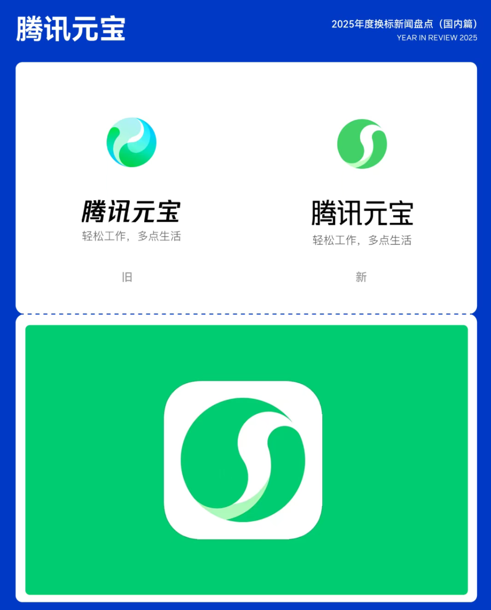 四月份,腾讯元宝对其应用程序图标进行了更新。新版图标则通过简化色彩层次,主色调仅保留绿色与白色,在保留太极图核心元素的基础上,提升了整体识别性与视觉记忆点。22.腾讯元宝