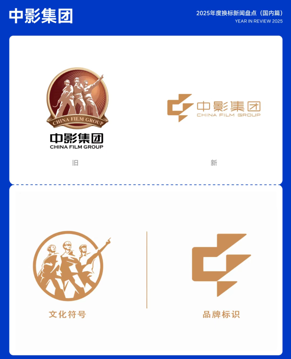 2025年6月21日,中国电影股份有限公司正式更名为中国电影产业集团股份有限公司。9月5日,中影集团发布「旗帜」版全新品牌LOGO,并同步推出覆盖创作、发行、放映、科技等领域的全产业链焕新计划。全新品牌LOGO以甲骨文「中」字为设计源头,融合中国传统文化意象与当代视觉语言,整体造型宛如一面迎风挺立的旗帜,既彰显中影作为中国电影重要引领者的象征意义,也寓意其根植中华文化、持续向上生长的发展精神。10.中影集团