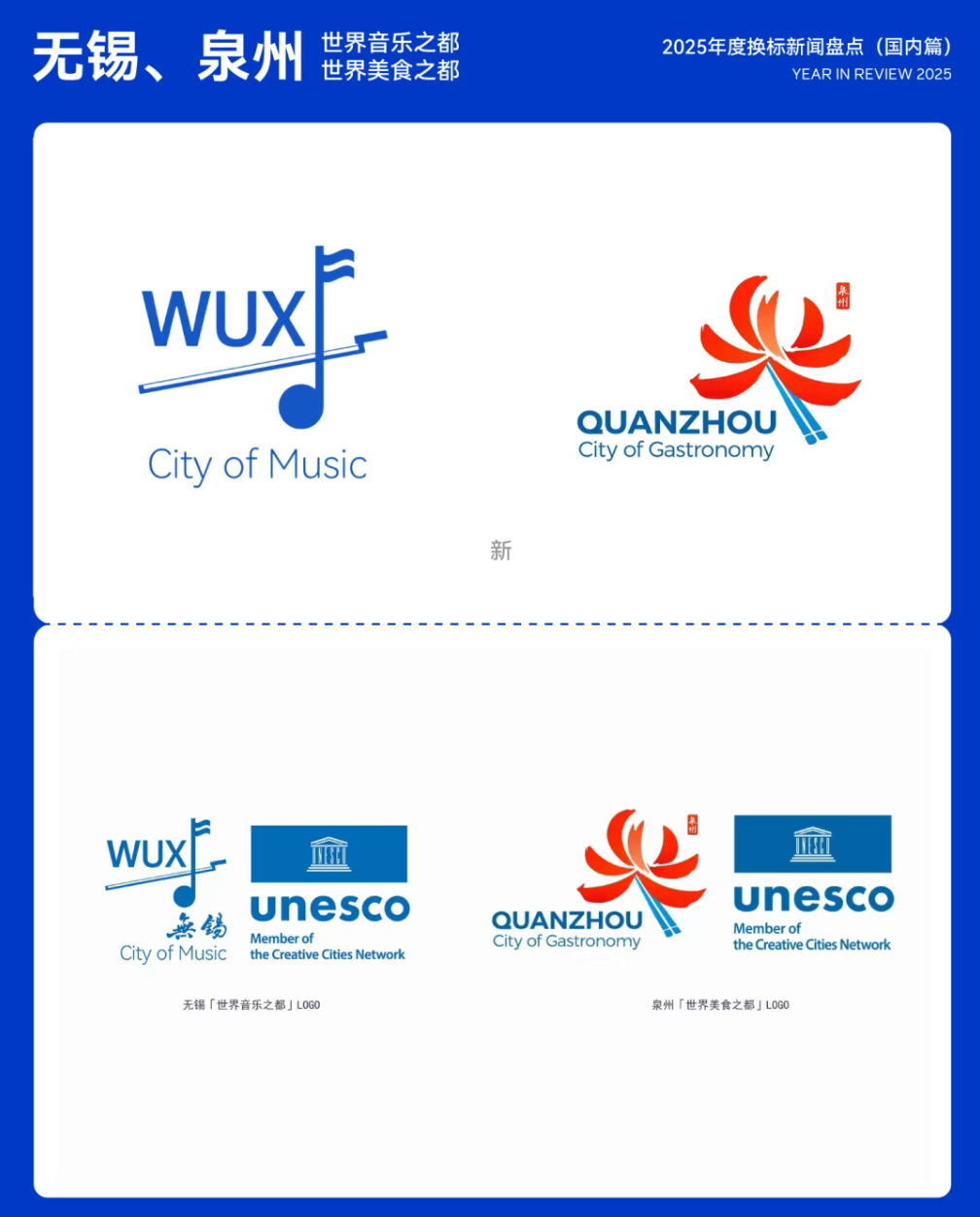 2025年10月31日,无锡和泉州入选联合国教科文组织创意城市网络,分别成为「世界音乐之都」和「世界美食之都」,标志着中国在该领域的影响力进一步提升。无锡作为首个获此称号的城市,其LOGO融合音乐元素与城市文化象征,彰显其深厚音乐传统。泉州则以刺桐花为设计核心,展现其美食文化与历史底蕴。25.无锡和泉州世界之都