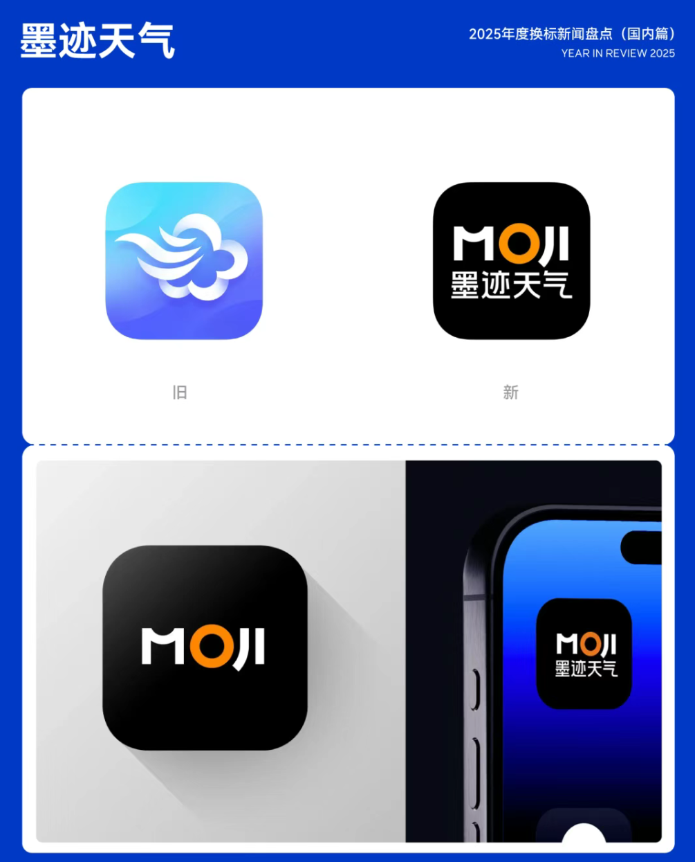 2025年7月14日,墨迹天气在 iOS 版本升级后同步推出全新品牌形象。新图标采用黑底白字的极简风格,以「MOJI」字母作为核心视觉,其中字母「O」以橙色突出,形成明确视觉焦点,提升品牌识别度;图标下方辅以「墨迹天气」字样,强化品牌名称的直观传达。07.墨迹天气