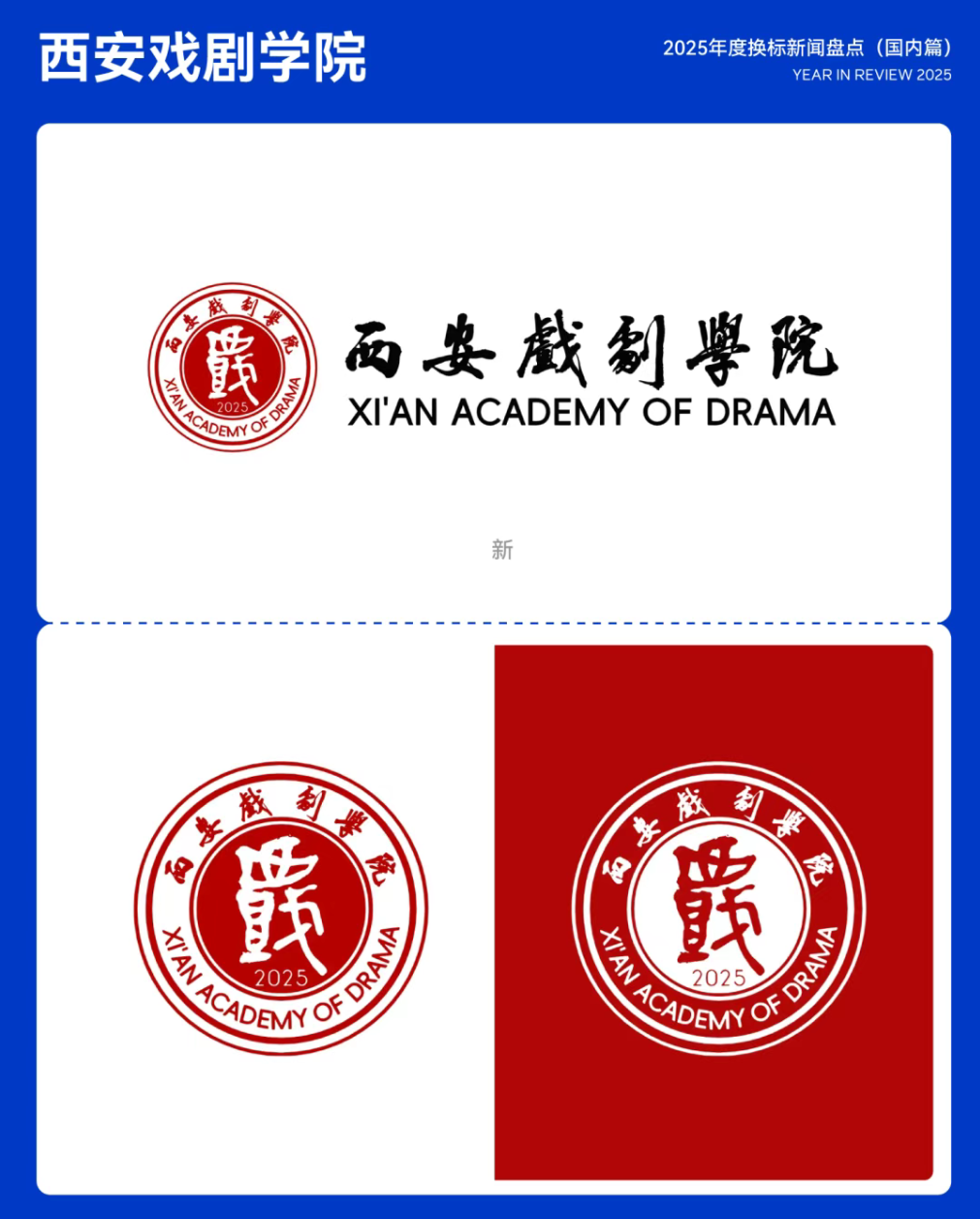2025年9月10日,西安戏剧学院正式揭牌,成为中国第三所公办戏剧类本科院校。学院院徽采用高校常见的圆形结构,中心以书法形式呈现「西戲」二字,厚重有力,既呼应传统印章的视觉语言,也凸显鲜明的地域与文化特征;下方标注创始年份「2025」,外圈环绕学院中英文名称,构成庄重而完整的视觉识别体系。29.西安戏剧学院