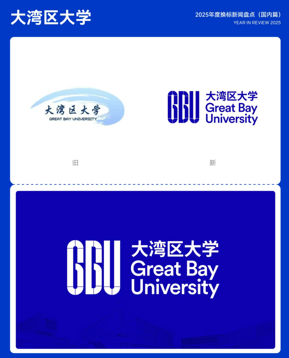 大湾区大学是一所由广东省人民政府举办、东莞市政府保障的公办高校,定位为高起点、小而精、研究型、国际化的新型大学,致力于引领科技与社会进步。其校徽以几何化字母GBU构成,体现创新与科技感,主色调采用高饱和度蓝色,彰显年轻、国际化形象。尽管设计富有特色,但字母B与G的识别性存在一定问题。18.大湾区大学