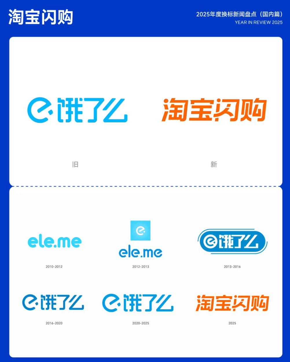 2025年12月5日,平台宣布全面焕新为淘宝闪购,并同步发布全新橙色品牌 LOGO。新LOGO彻底告别以往视觉体系,采用更具力量感与速度感的字体设计,整体笔画略微前倾,营造出强烈的前冲动势,直观传达“闪送、即时达”的服务特性。其中「闪」字内部撇、点的夸张处理,进一步强化速度感,并隐约勾勒出奔跑者的形象。15.淘宝闪购