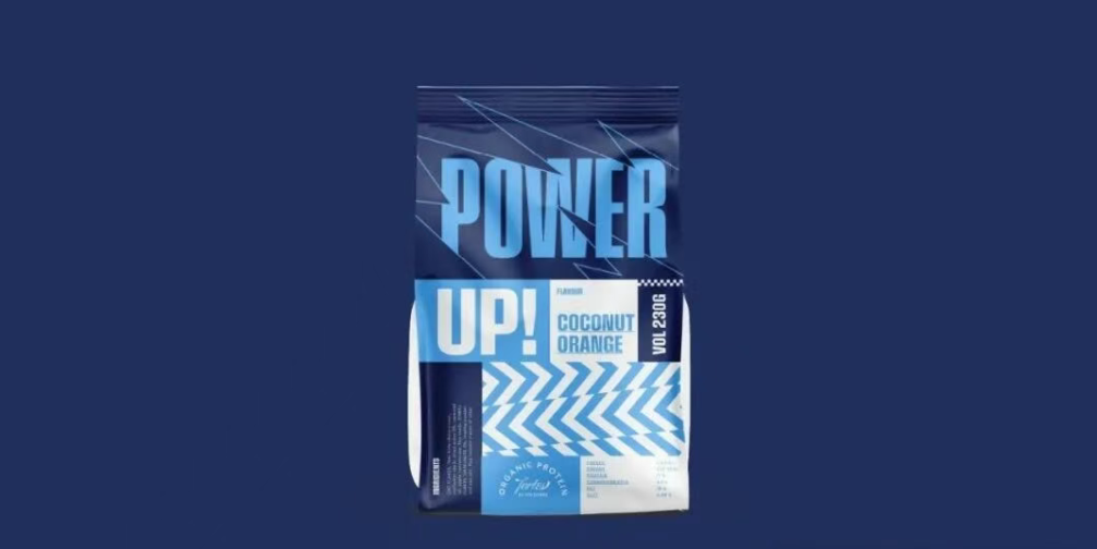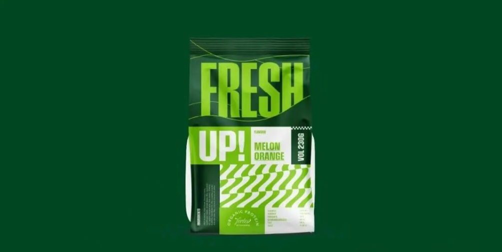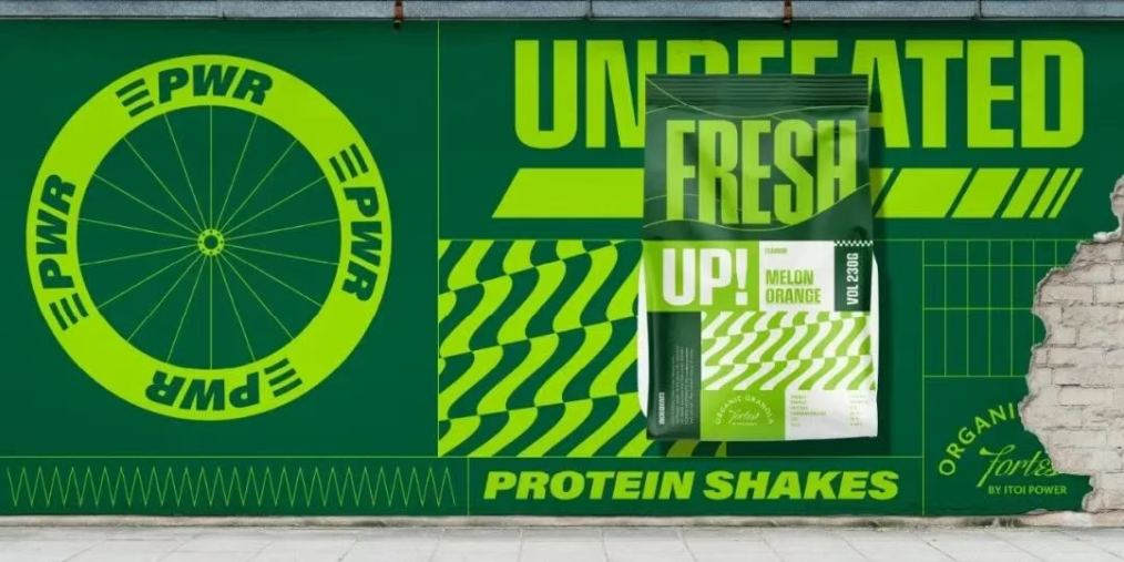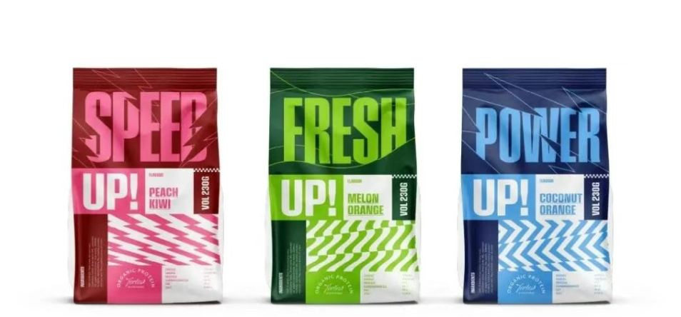 包装中“SPEED/FRESH/POWER” 等文字采用粗体破碎字体,搭配 “UP!” 的醒目排版,强化 了“能量提升” 的视觉冲击力,让包装自带活力气场。再辅以高饱和的色彩,高度适配年轻健身群体高效、活力、个性的需求,使这款蛋白粉的补给属性,成为活力生活的专属符号。