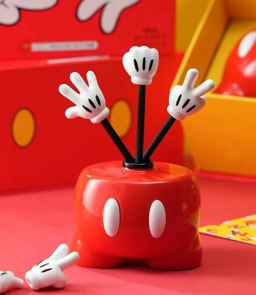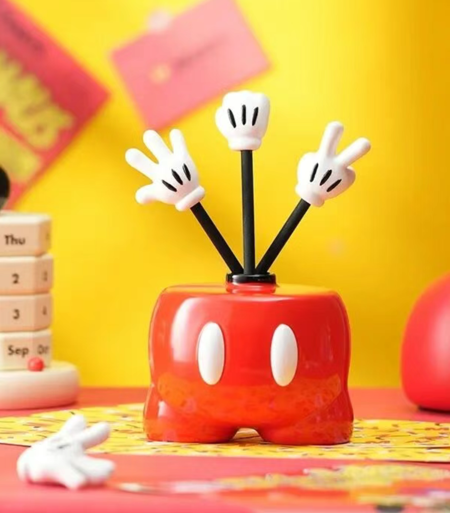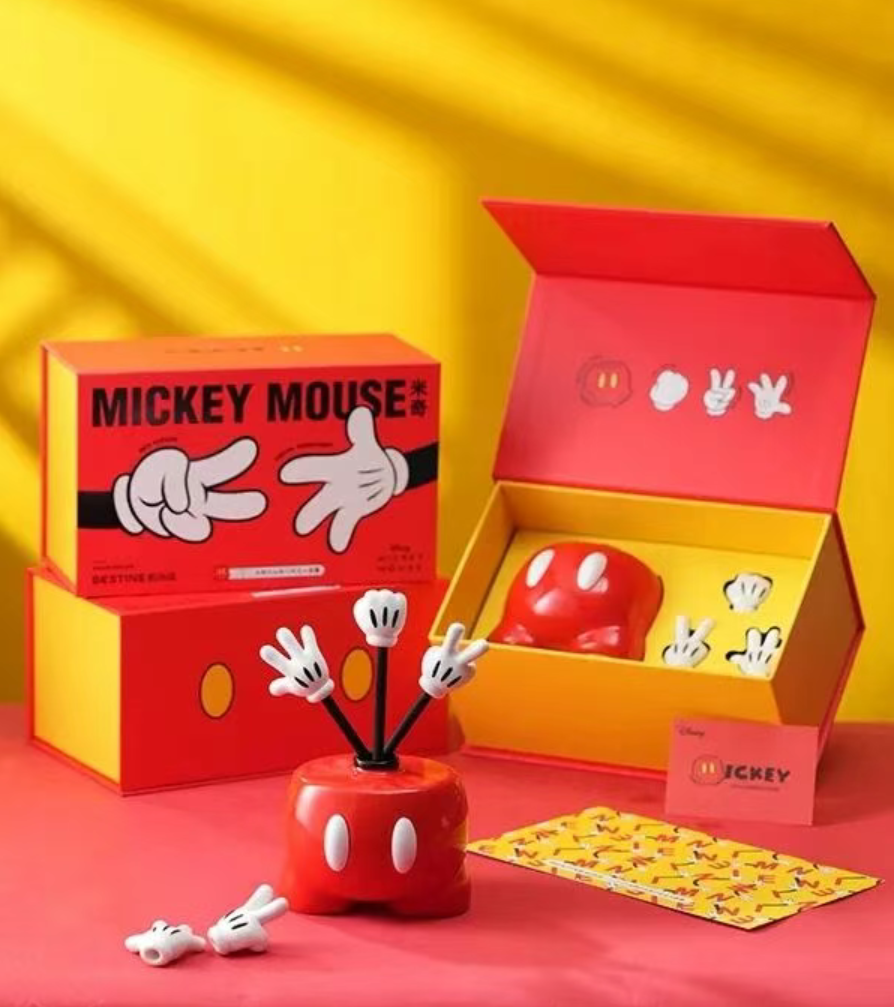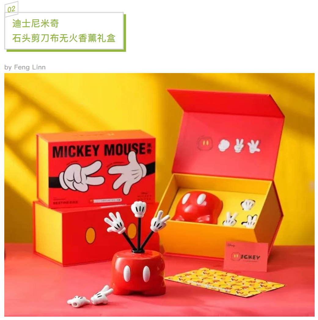 米奇主题香薰礼盒,产品则将米奇标志性的红色短裤转化为香薰瓶身,并使用米奇标志性的白色四指手套作为扩香条,强化角色辨识度,也让香氛散发过程更具戏剧化与互动感。手部造型与瓶身(裤子)形成角色完整度,仿佛米奇“藏”在瓶中伸出手来,营造出萌趣生动的视觉故事。